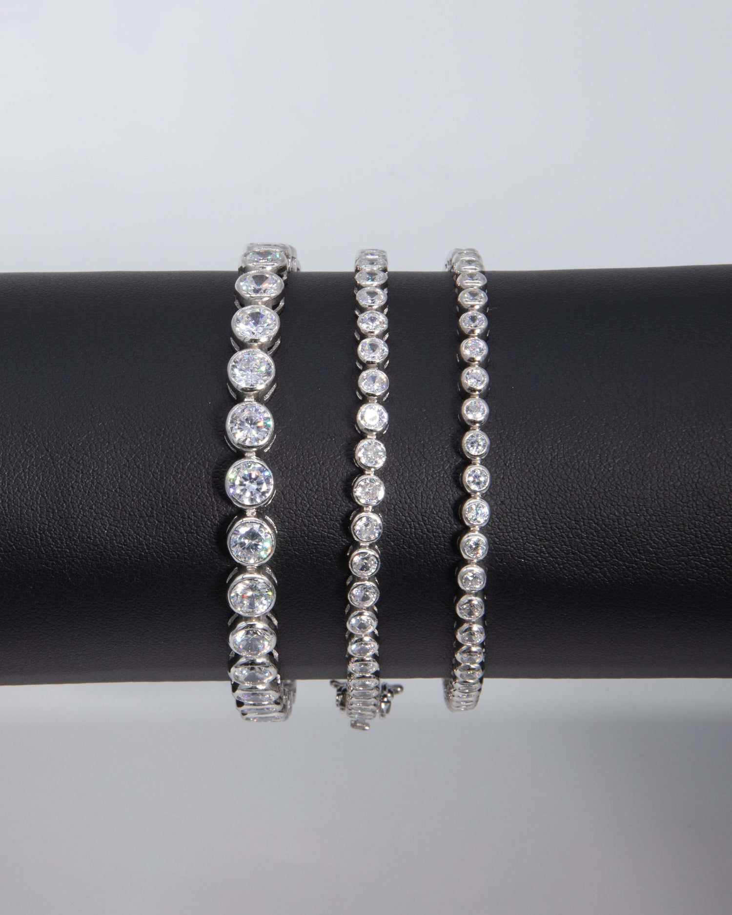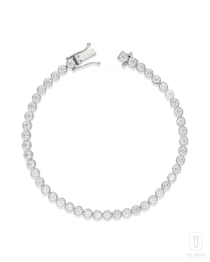 This tennis bracelet is made with sterling silver 925 and is adorned with 6.30 carats of cubic zirconia (CZ). It is available in a size of 6.5 inches.