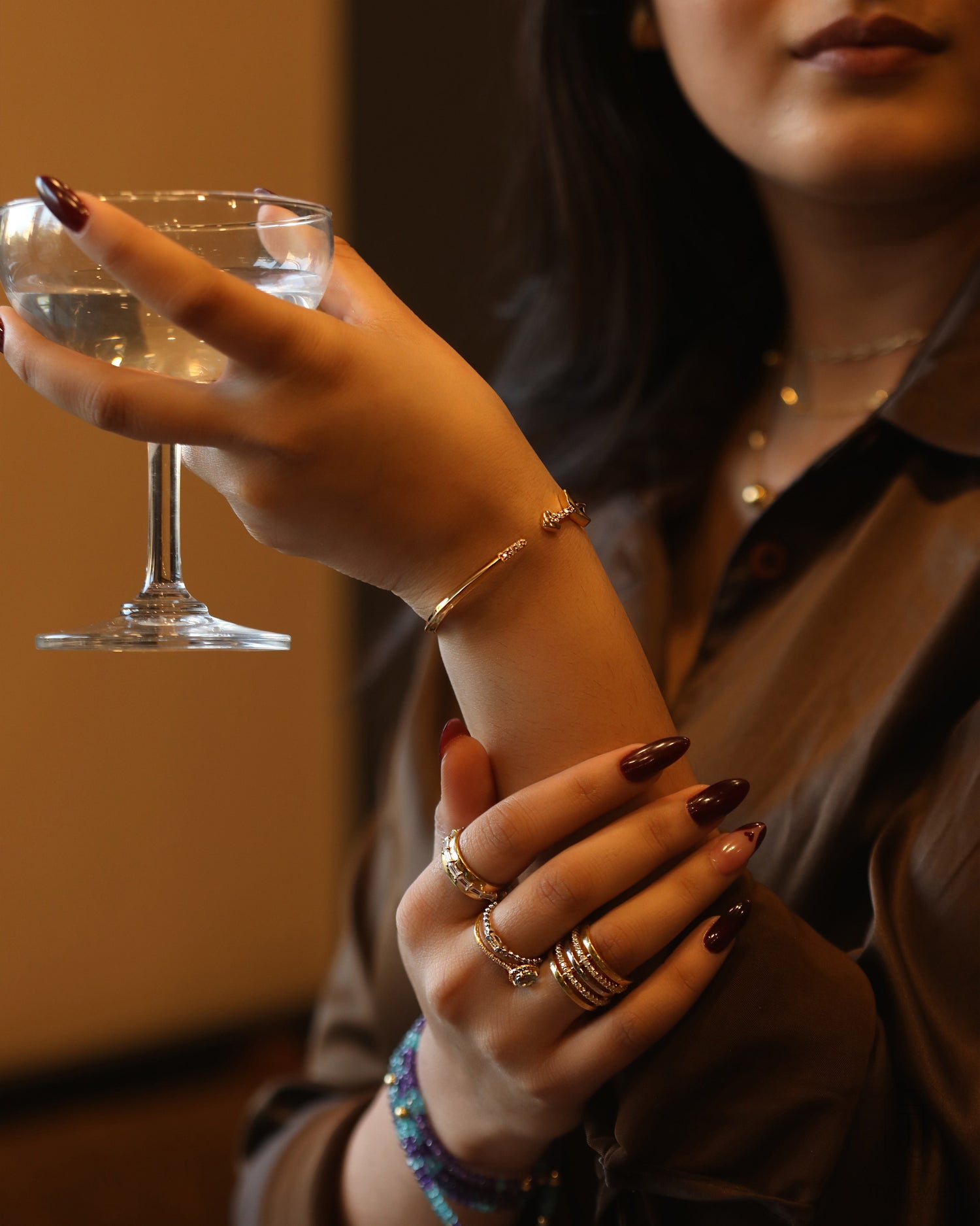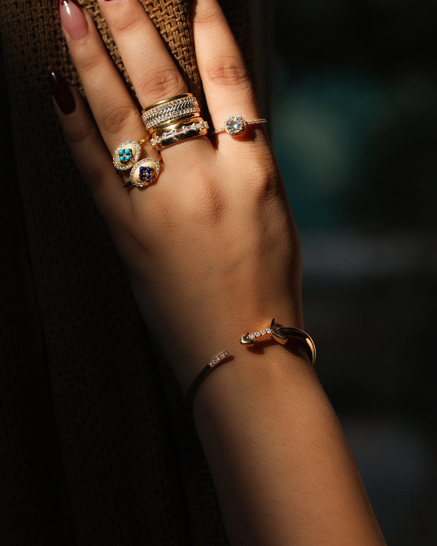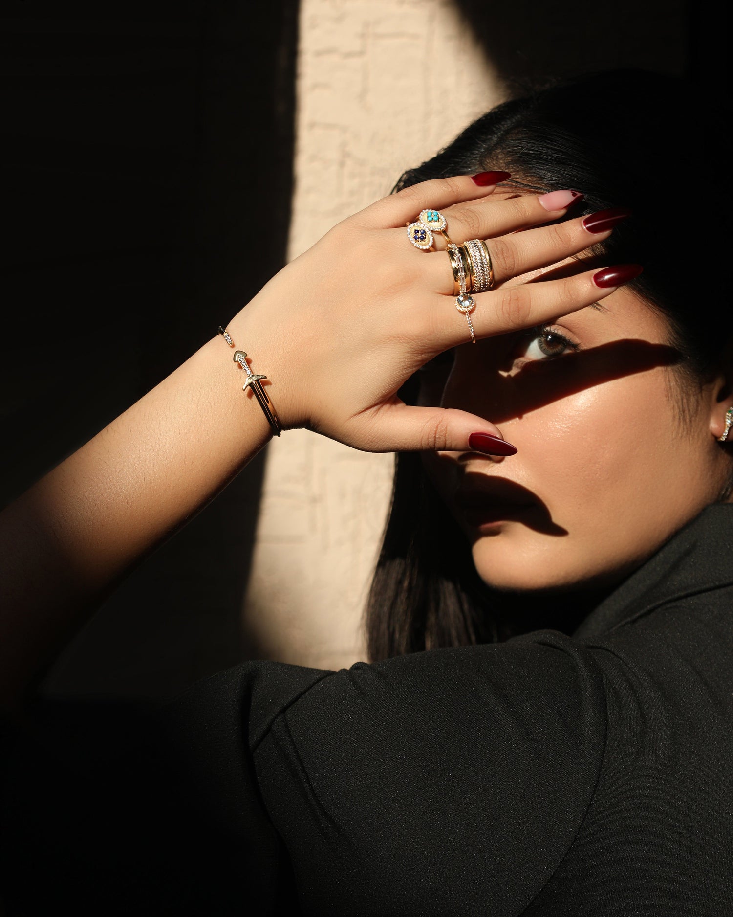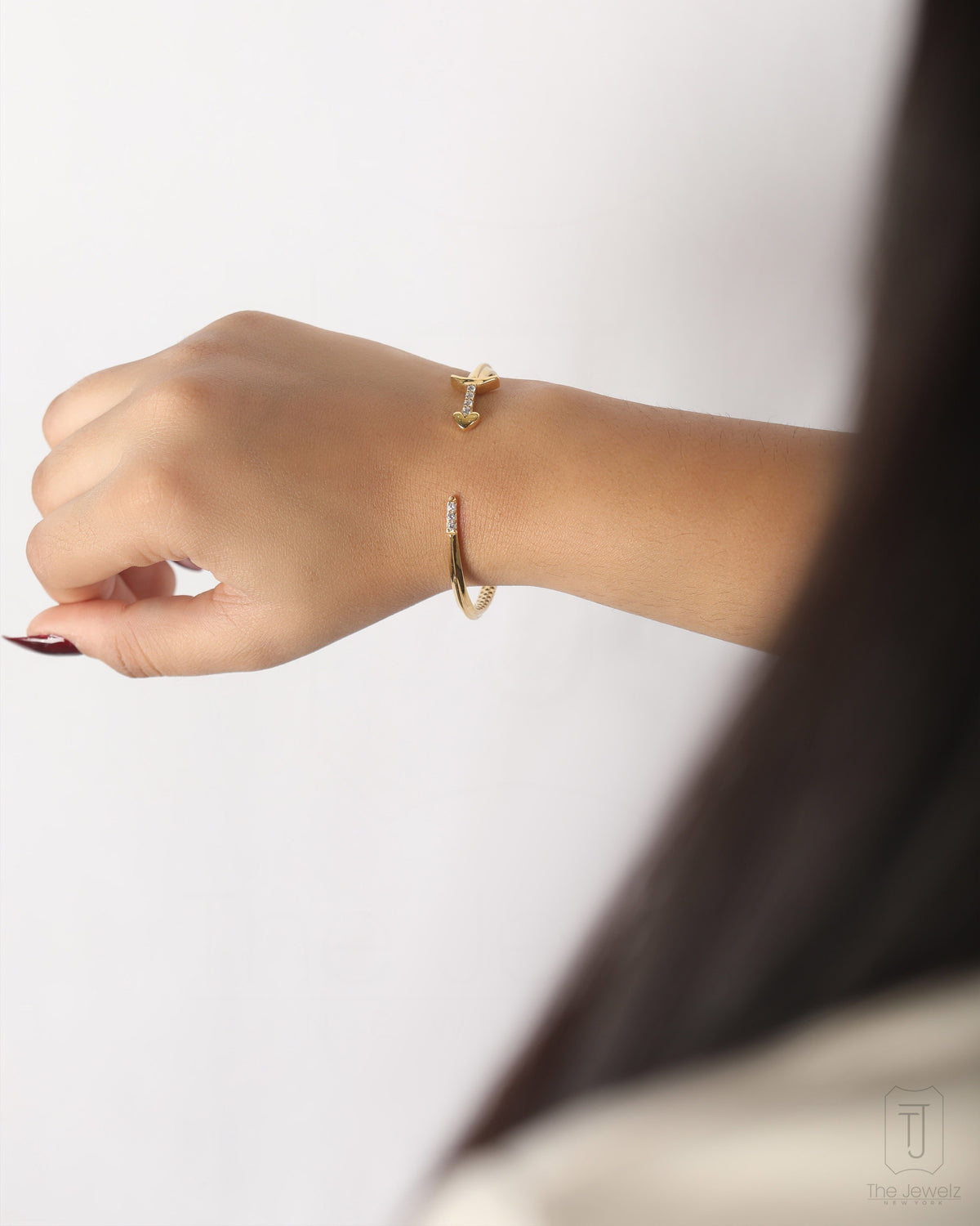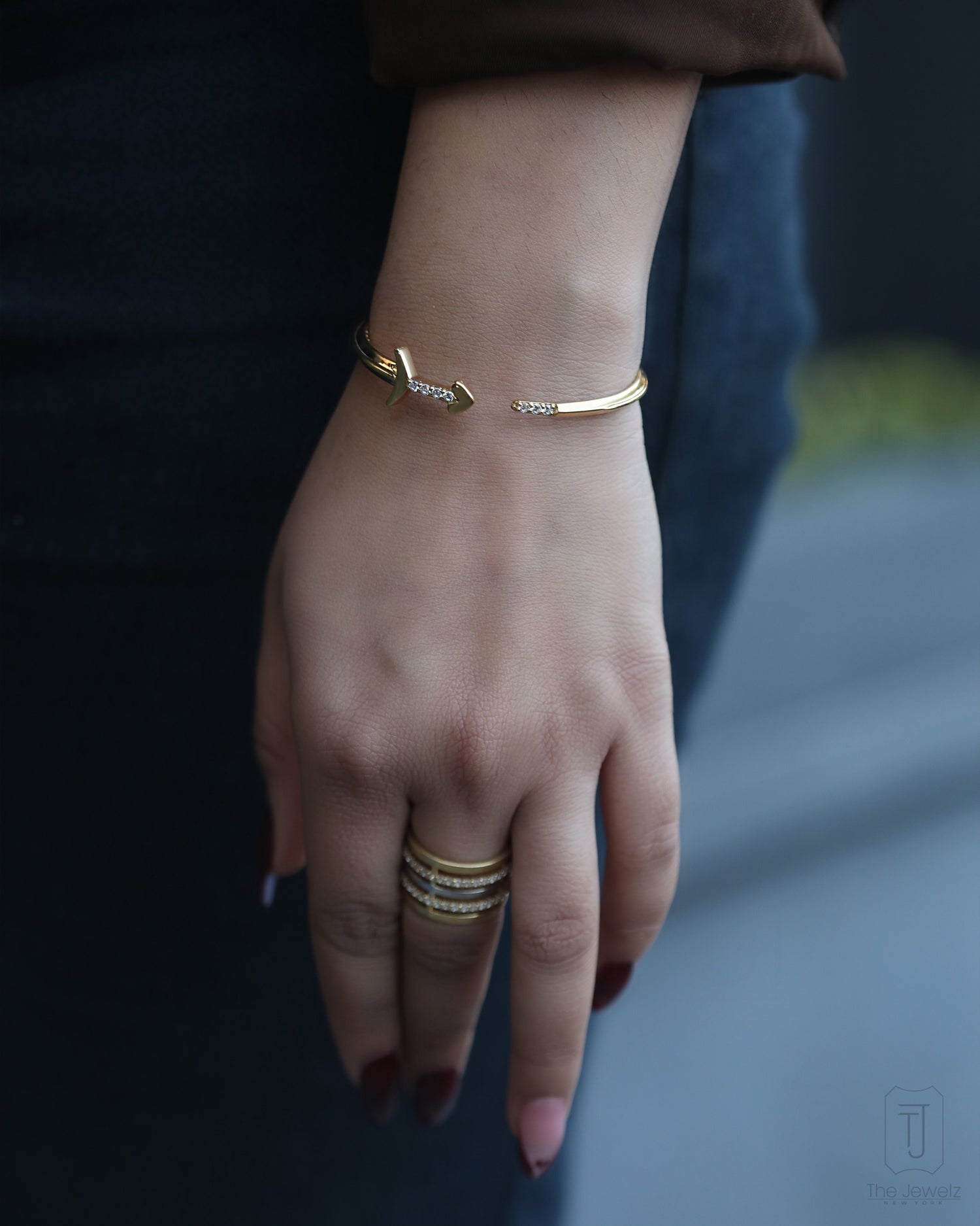 This Sword Cuff Gold Plated Bracelet by The Jewelz is a statement of fearless charm. Radiating a golden glow, it blends sleek power with playful sparkle—an emblem of destiny and daring style. Designed as a bold cuff, it transforms any look into a main character moment, symbolizing strength and allure.