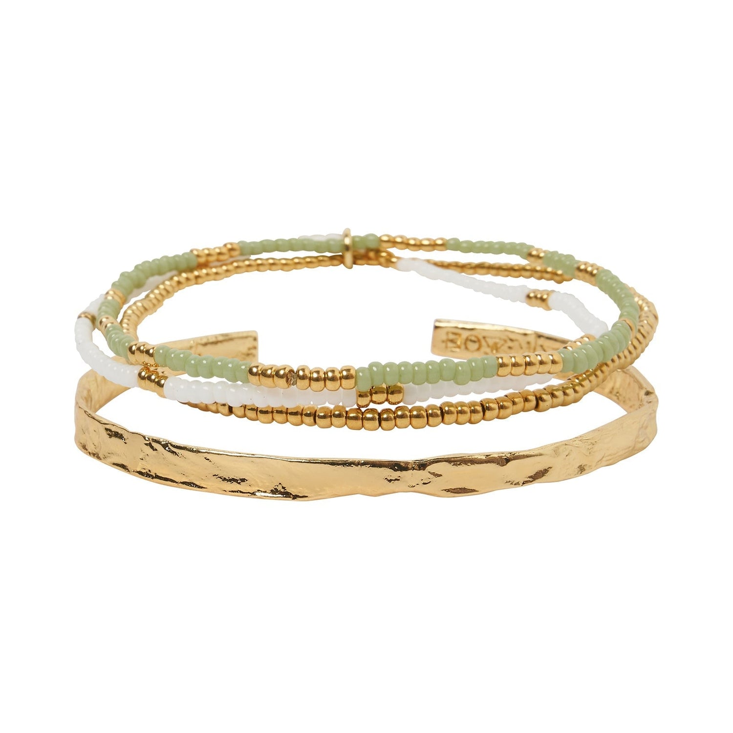 The Sunshine Bracelet Stack by Arms of Eve is a classic and colorful set perfect for brightening up any outfit. It includes a gold cuff and three beaded bracelets in a forest green color, creating a perfect everyday stack.