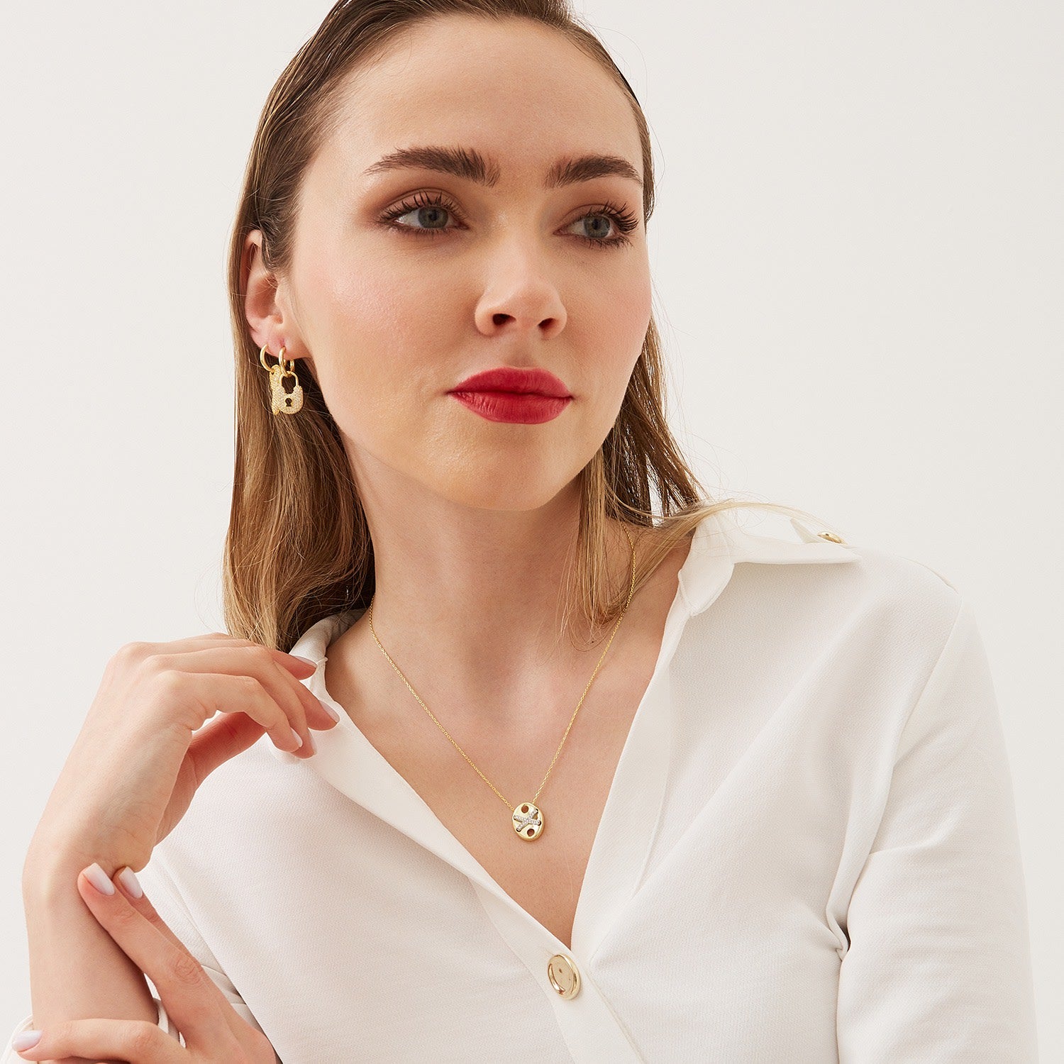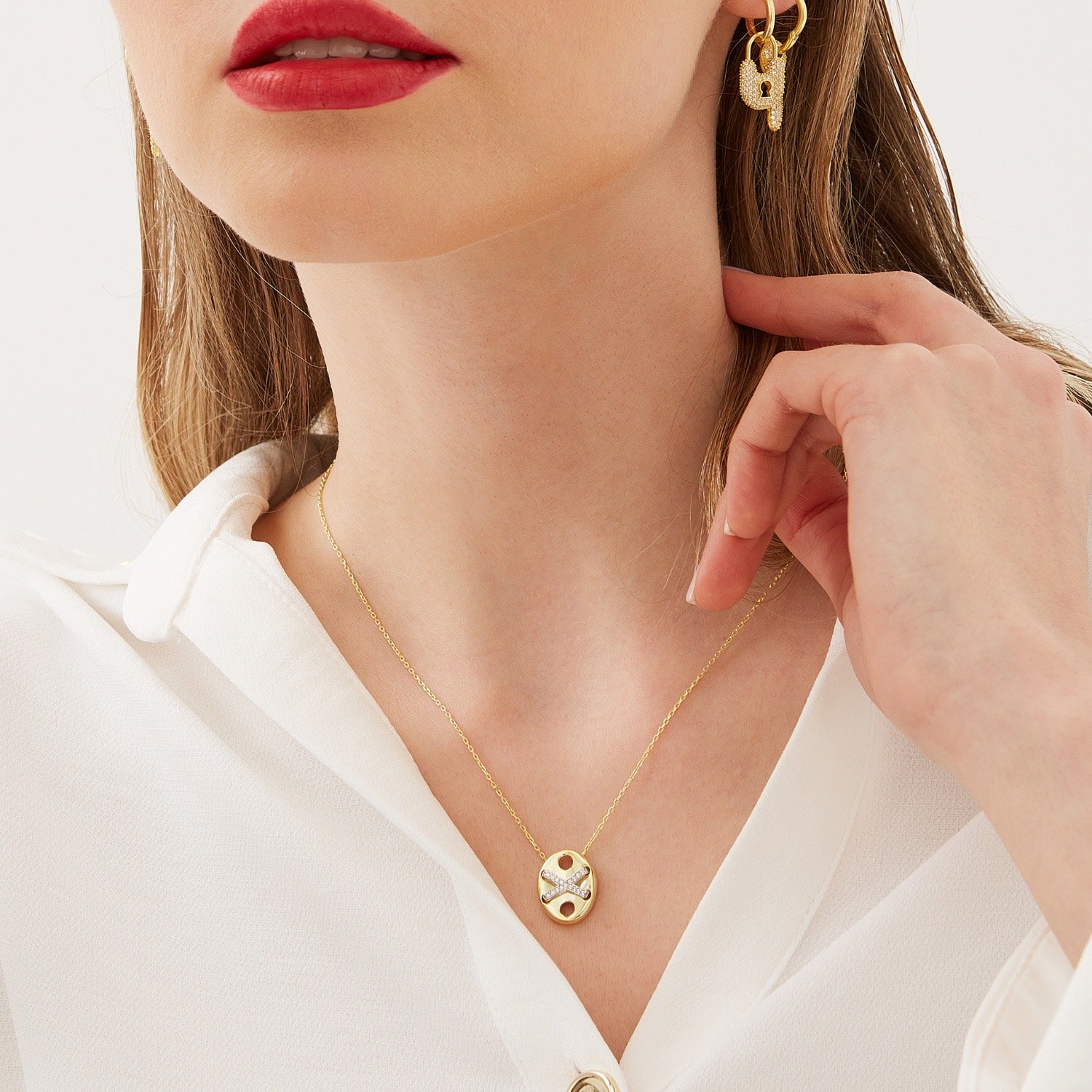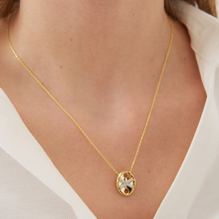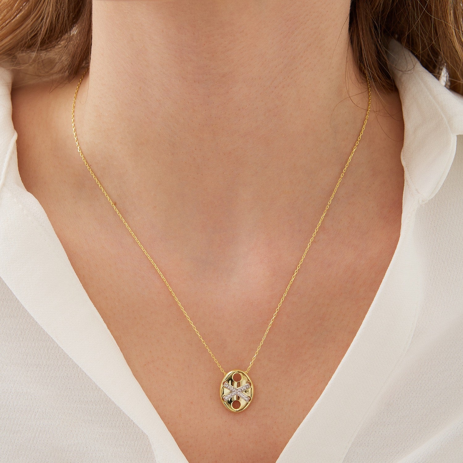 This necklace is made from recycled sterling silver and features an elliptical-shaped pendant with a cubic zirconia X. It has a minimalist adjustable chain.