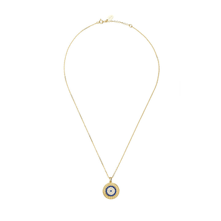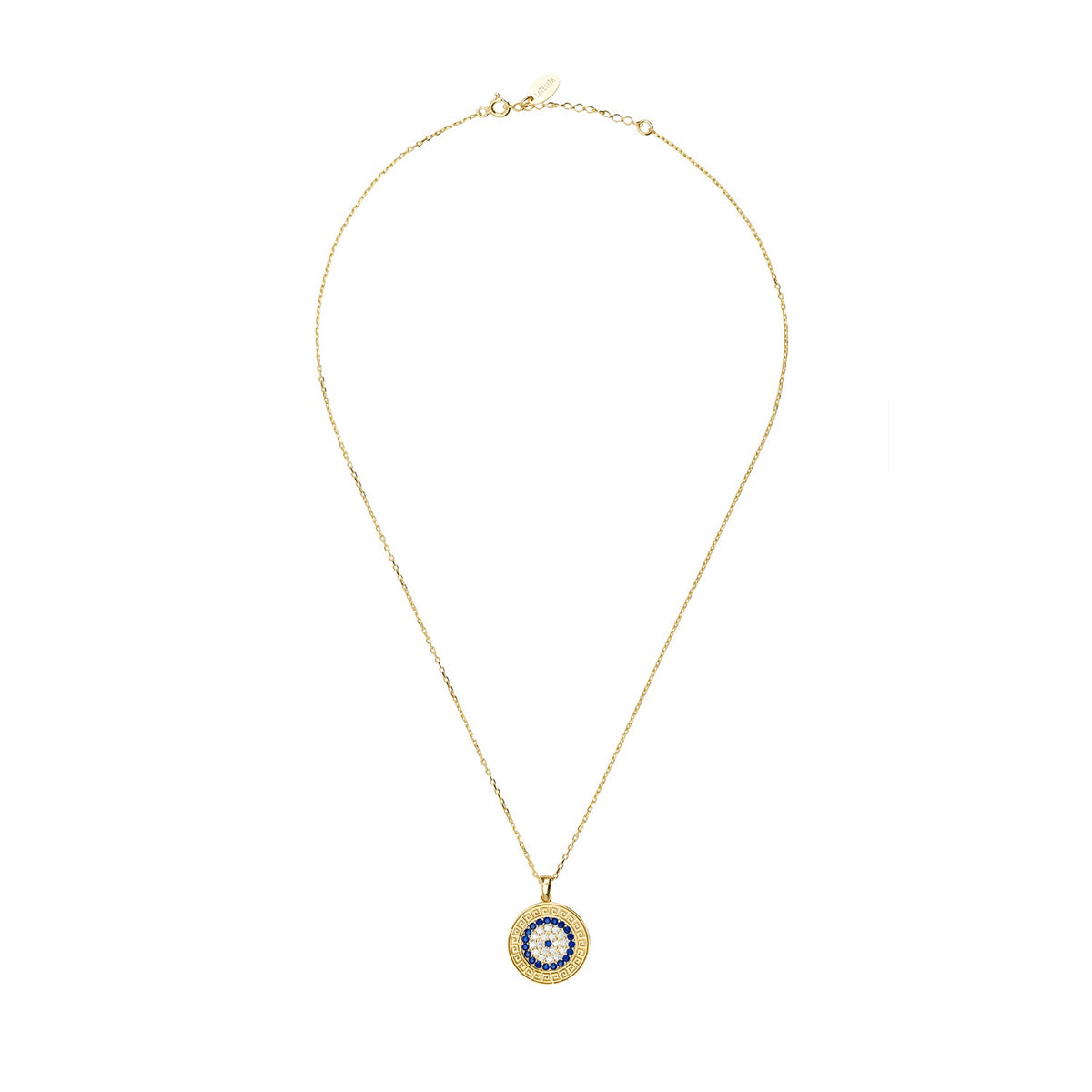 The Greek Evil Eye Disc Pendant Necklace Gold by Latelita is a meaningful and stylish accessory. It features a watchful evil eye set with brilliant blue and white cubic zirconia, framed by the iconic Greek Key motif, which symbolizes unity and infinity. Handcrafted in 925 sterling silver with an 18ct gold plating, this necklace is a symbol of strength and protection, perfect for turning heads while providing peace of mind.