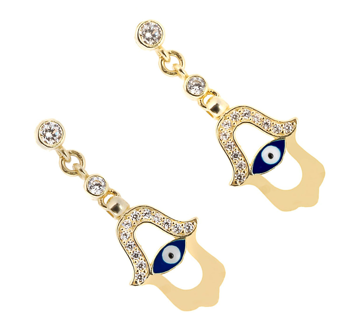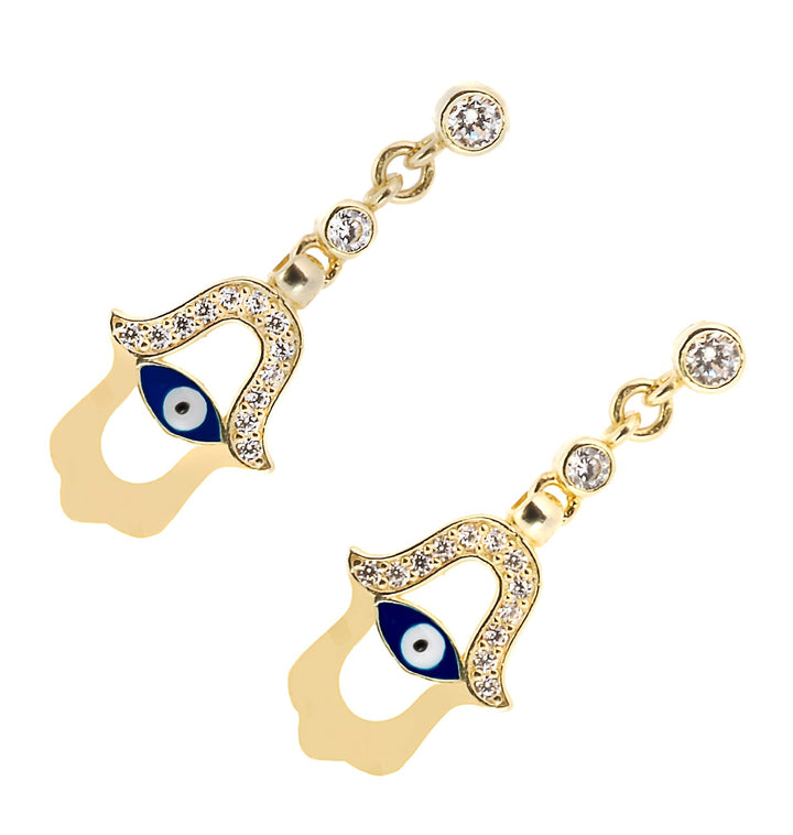 These earrings are made of 925 sterling silver plated with 18k gold. They feature a blue enamel evil eye and Hamsa symbol and are adorned with CZ diamonds.