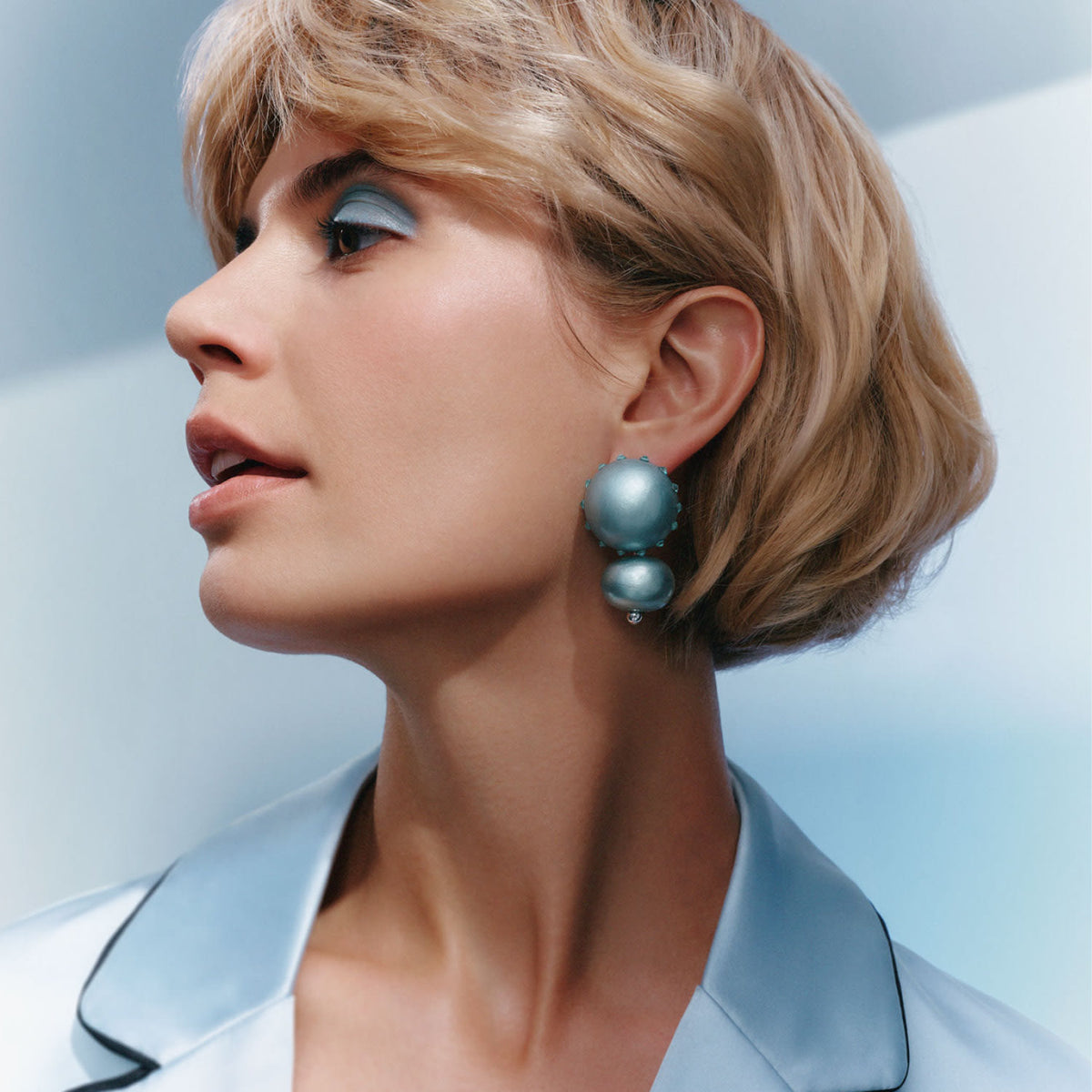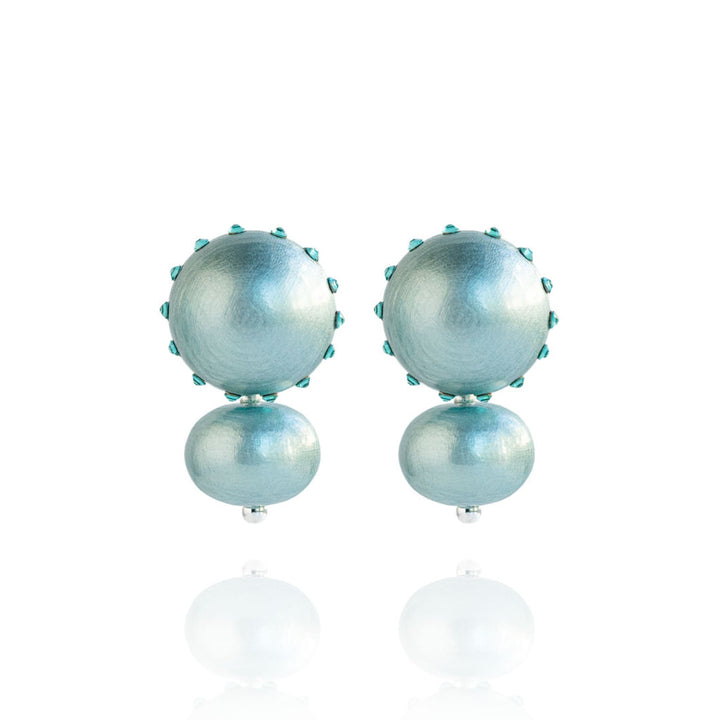 The Livia Earrings in Aqua Blue by Saule Label are an elegant and lively accessory. They feature an oversized dome post with delicate crystal accents and a dangling oval sphere, blending classic charm with contemporary flair. Hand-painted and handcrafted in Detroit, their sophisticated design makes them ideal for various occasions.