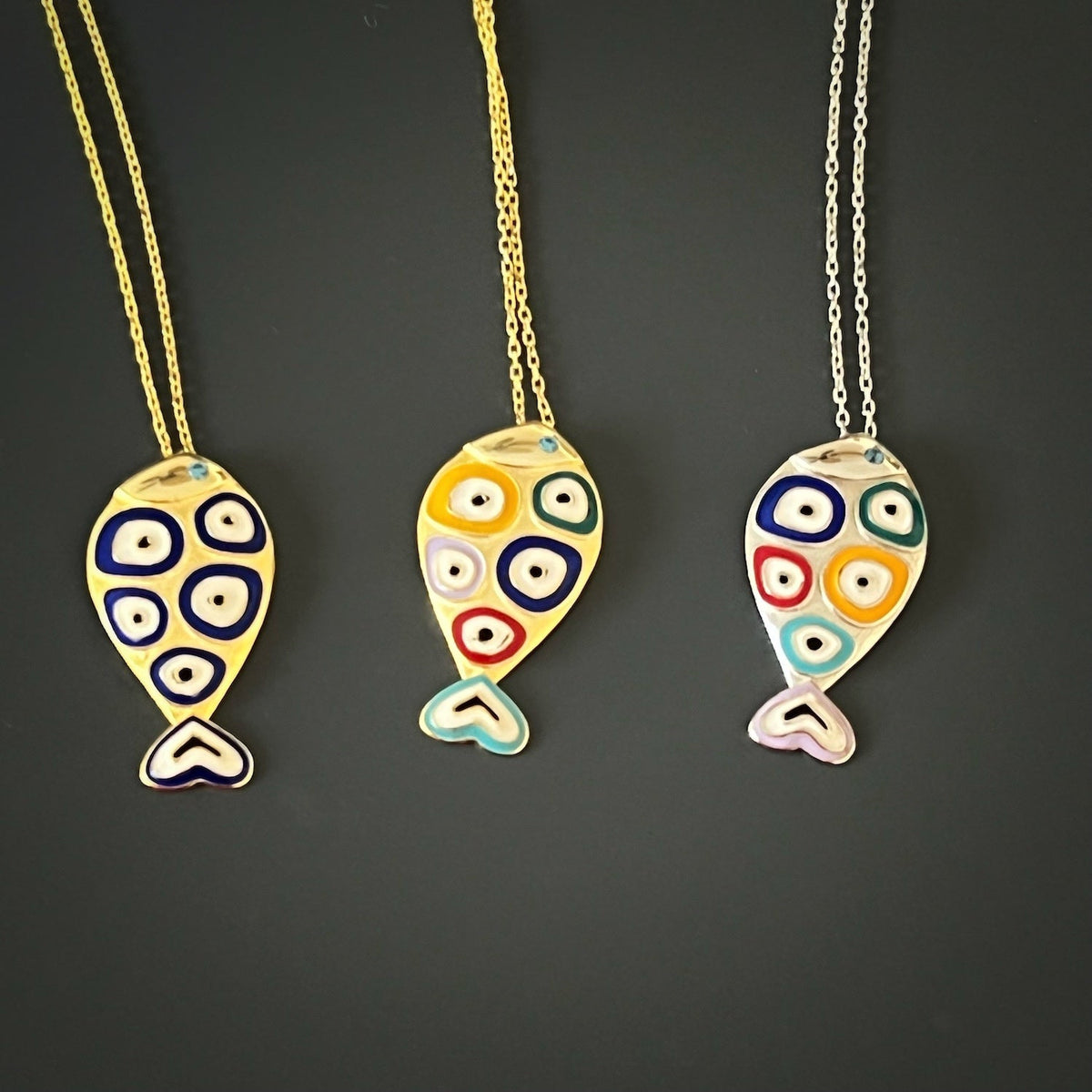 This Silver Evil Eye Fish Necklace by Ebru Jewelry combines two powerful protective symbols in one design. The fish, a universal sign of prosperity, is adorned with vibrant enamel evil eyes, believed to ward off negativity. A meaningful talisman with contemporary styling, it brings luck, positivity, and spiritual safeguarding to daily life.