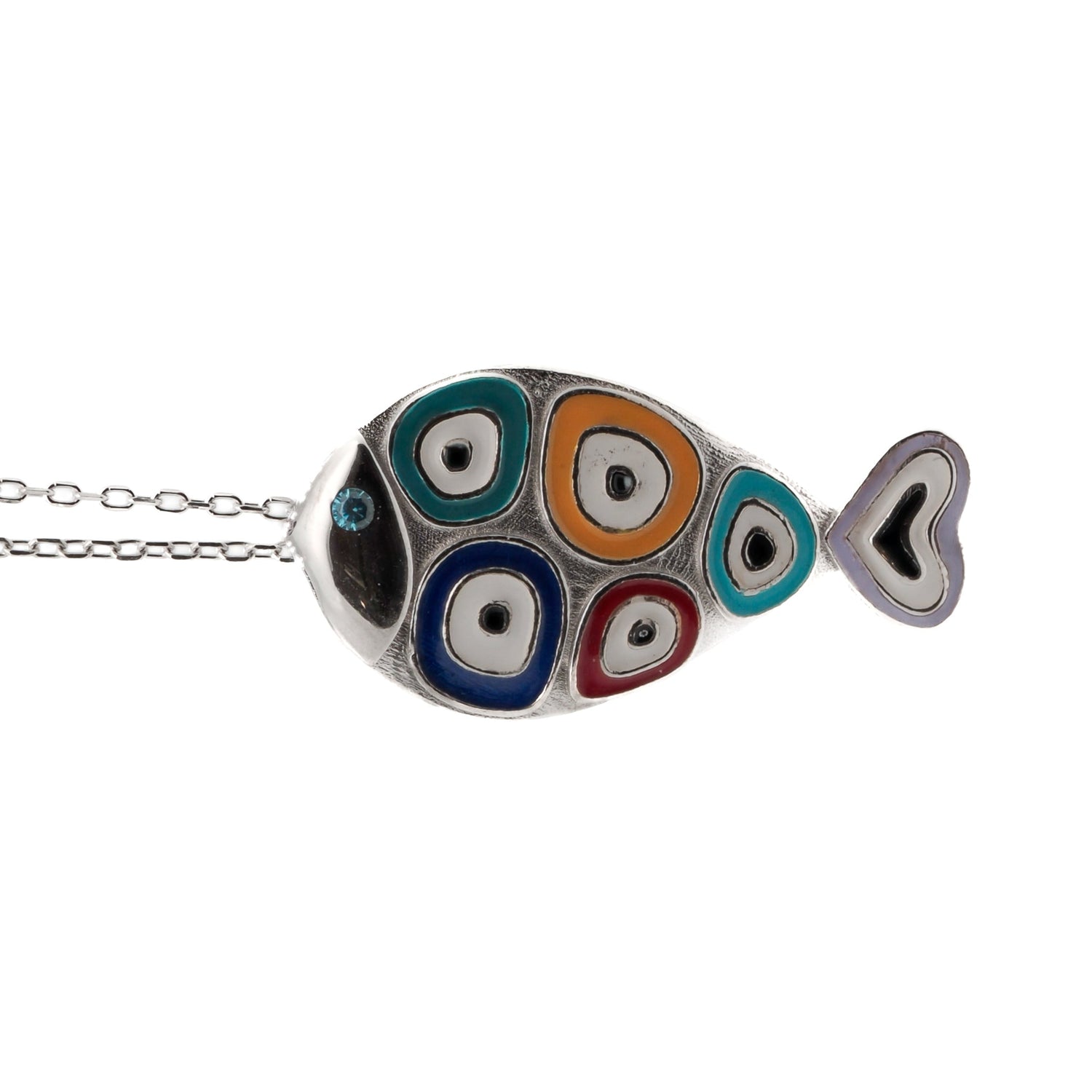 925 sterling silver chain with enamel evil eye fish pendant. Necklace length: 18" + 1.5" extender. Pendant size: 1.2" x 0.6".