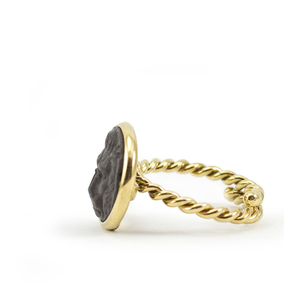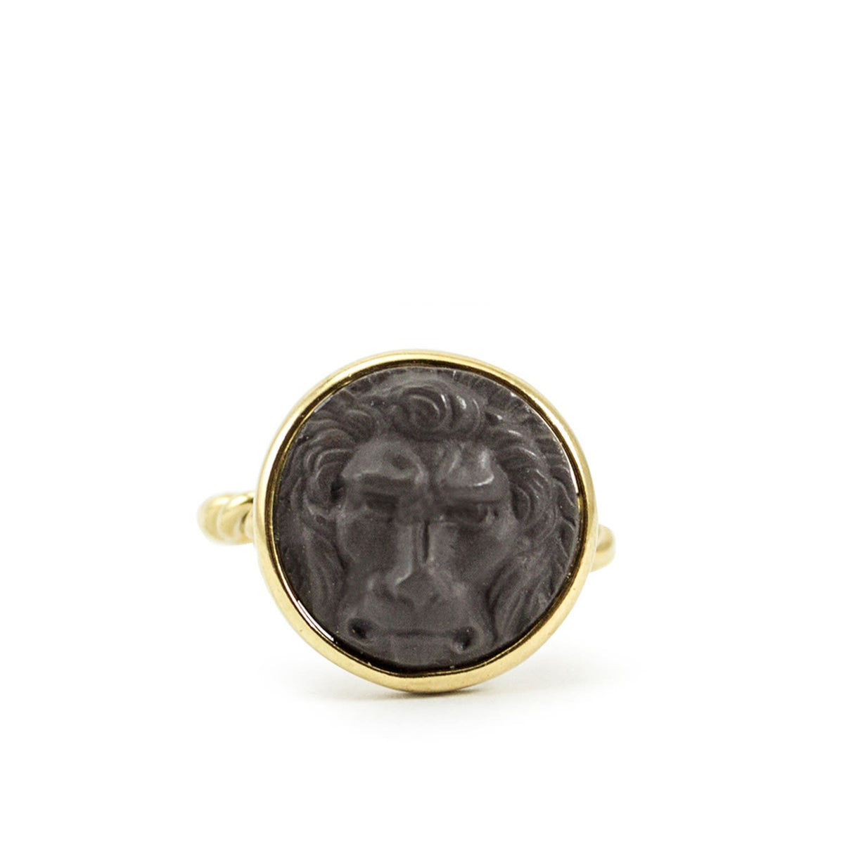 The Lion Cameo Ring by Vintouch is a handcrafted ring symbolizing courage and strength. It features a hand-carved lion cameo made from porcelain that is bezel-set in gold-plated silver. The cameo has a black marble-like appearance enhanced by gold shades.