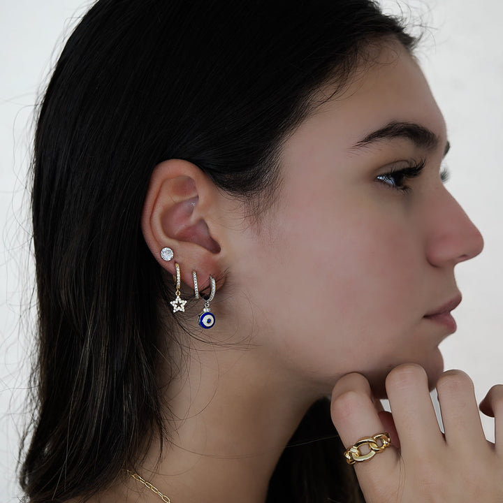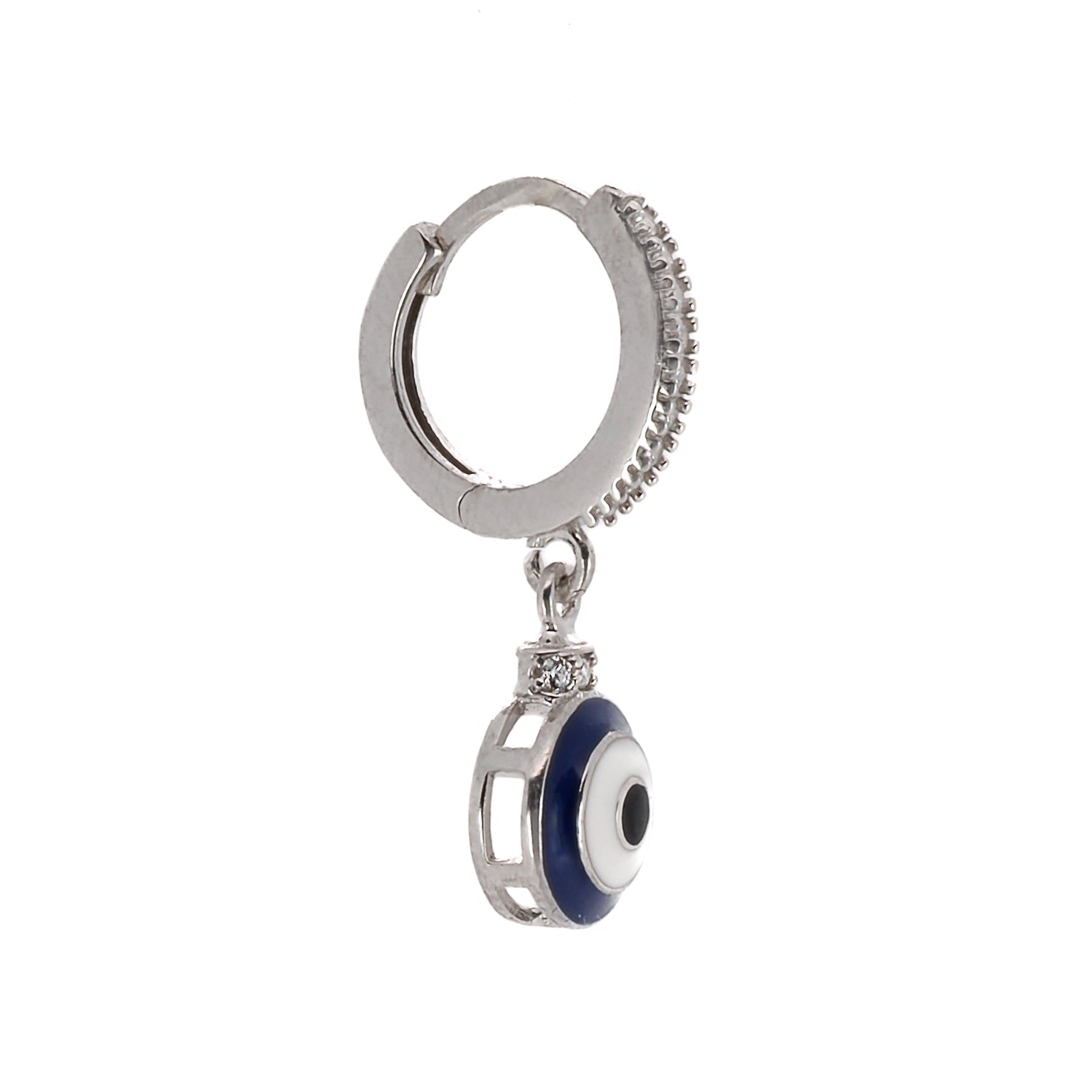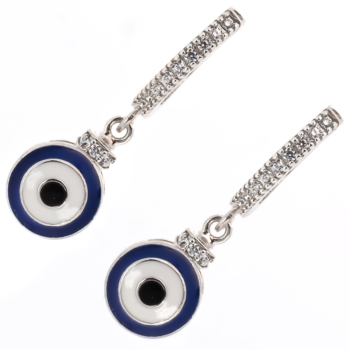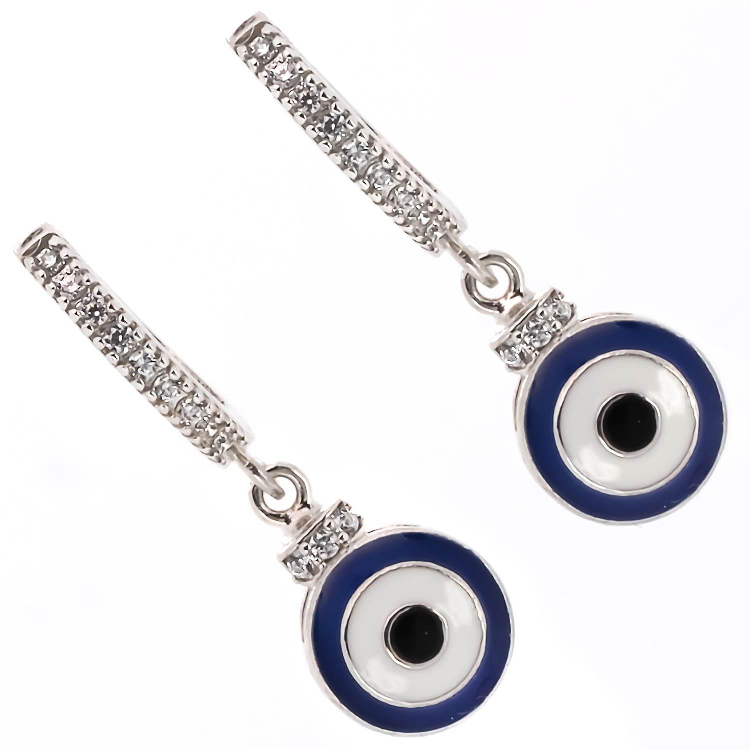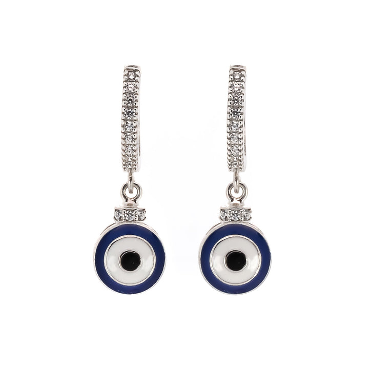 These earrings are made from 925 Sterling silver. They feature zircon stones and a blue enamel evil eye charm.