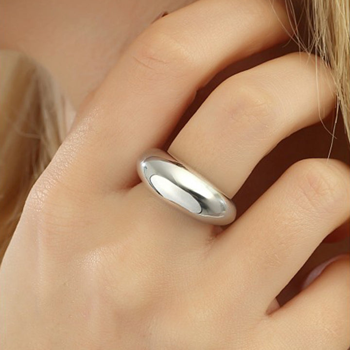 This adjustable ring is crafted from 925 recycled sterling silver and features a chunky dome crescent design. It is also available in gold and rose gold colors.