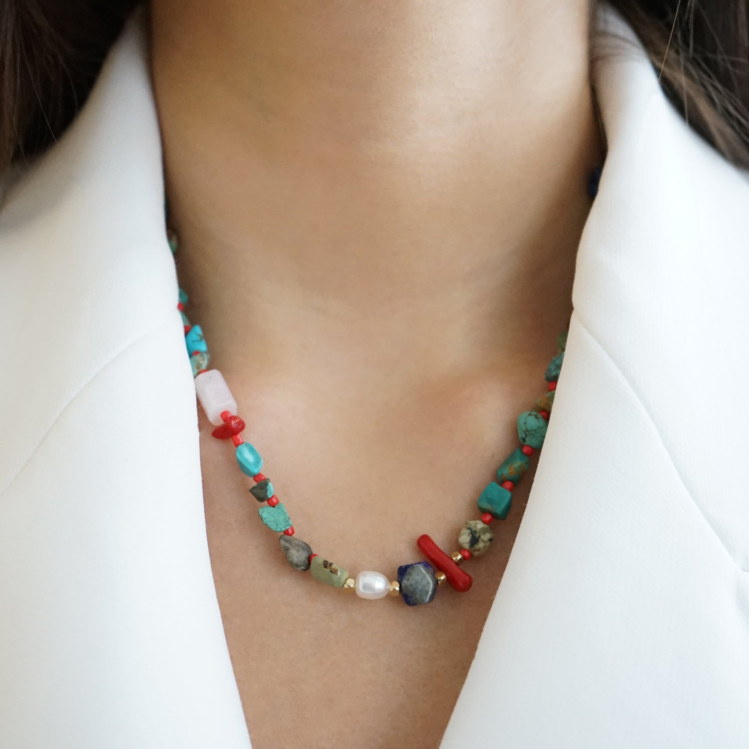 This necklace is made with a mix of turquoise, coral, and lapis lazuli gemstones, glass beads, freshwater pearls, and gold-plated stainless steel. It is handmade.