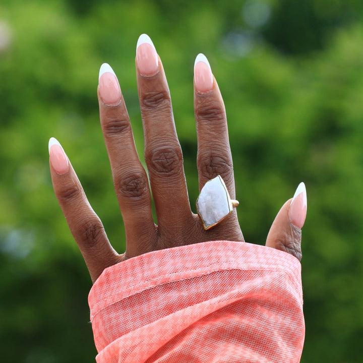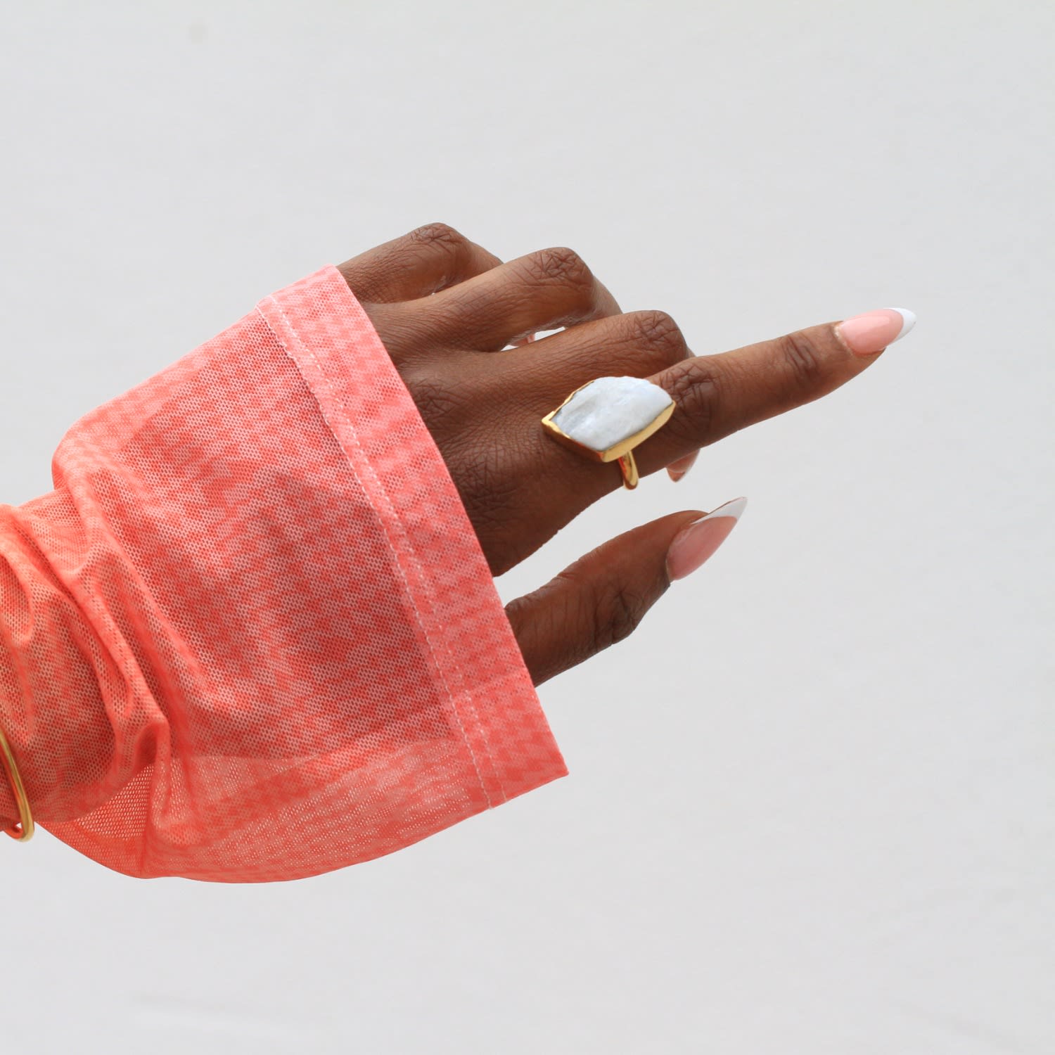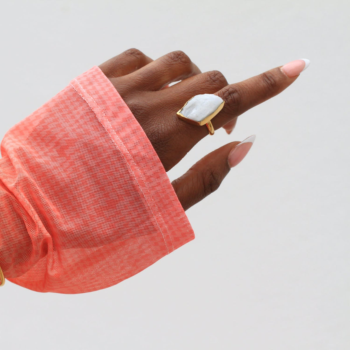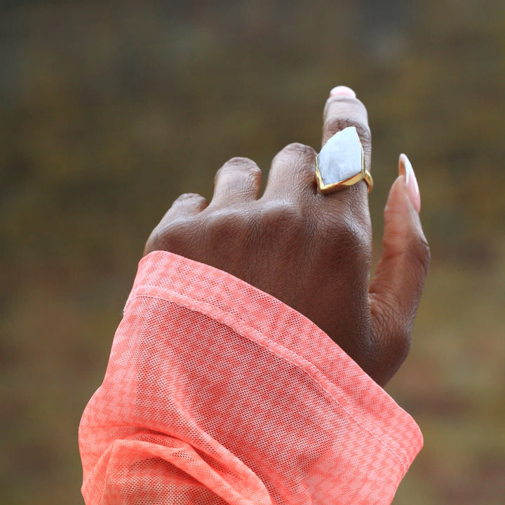 The Quiet Luxury Irregular Rainbow Moonstone Adjustable Gold Ring by Yaa Yaa London is a unique and elegant piece. It features a naturally uncut rainbow moonstone set in a hand-polished 18kt gold-plated brass setting. Each ring is one-of-a-kind, celebrating organic beauty with a raw edge. The open back and adjustable band offer a custom fit, making it perfect for everyday wear or statement styling.