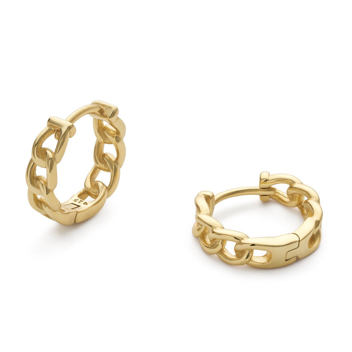 Crafted from solid sterling silver with genuine 14k gold plating, these earrings feature a chain hoop design. They measure approximately 11.5mm in diameter and have a butterfly back. They are also available in silver.