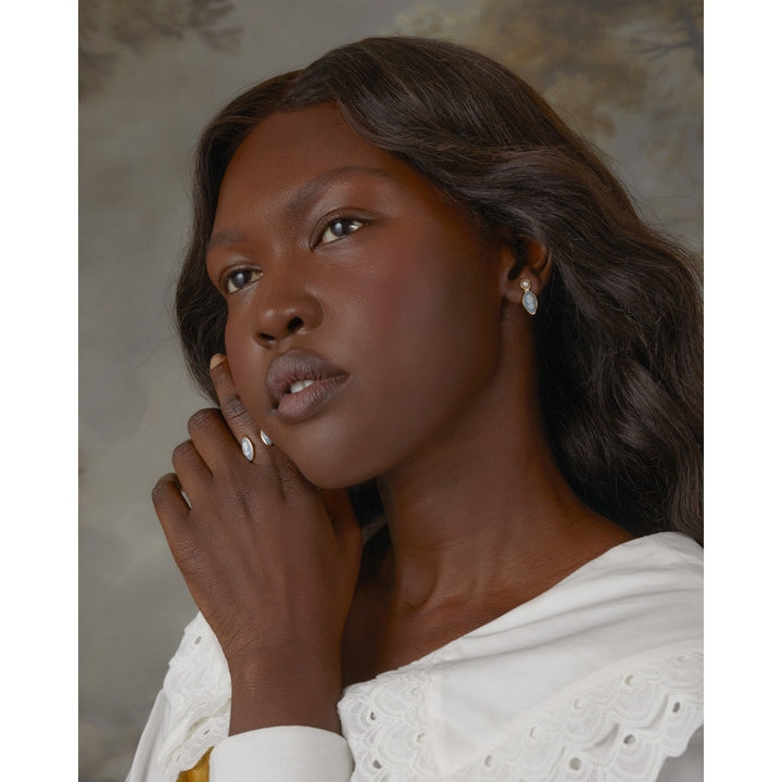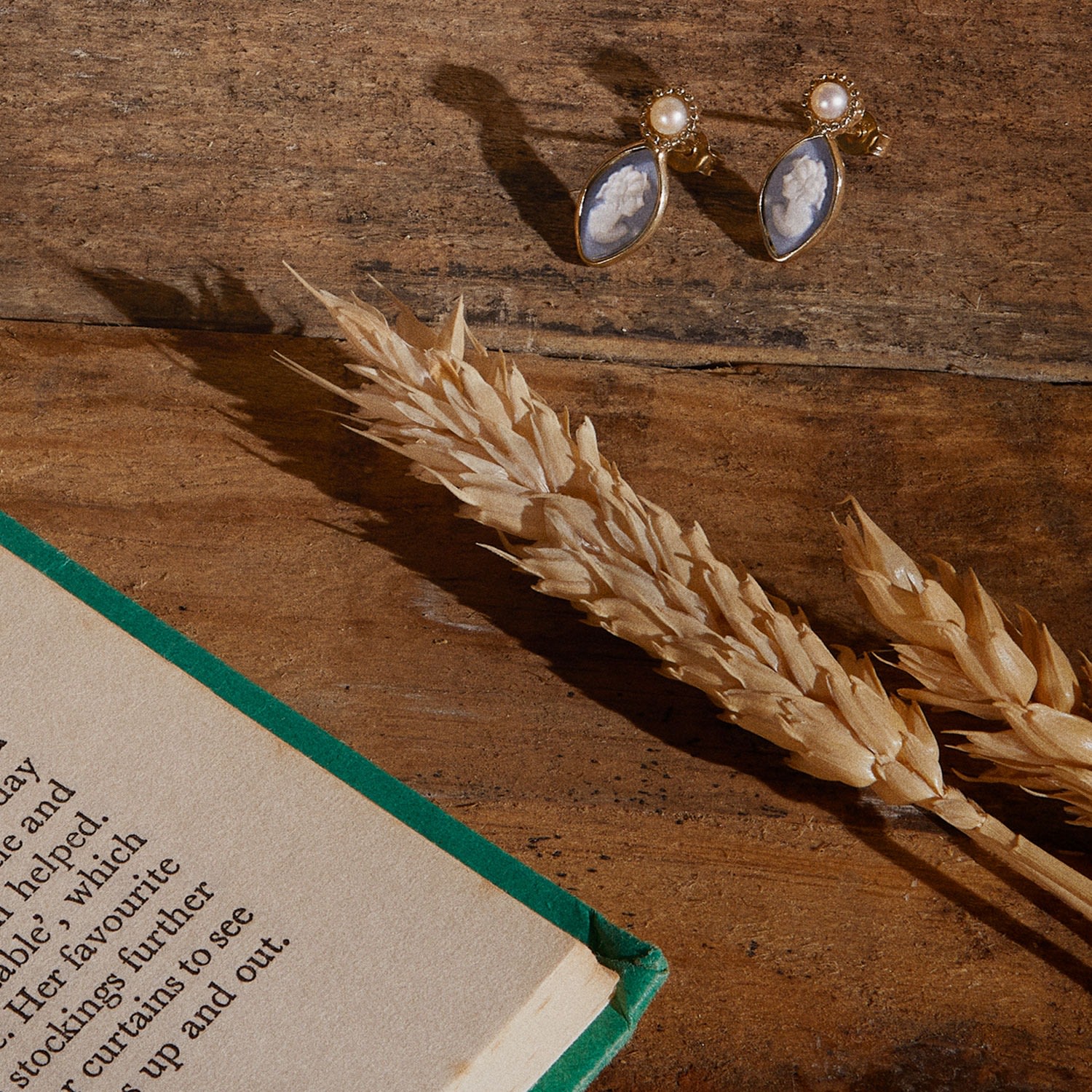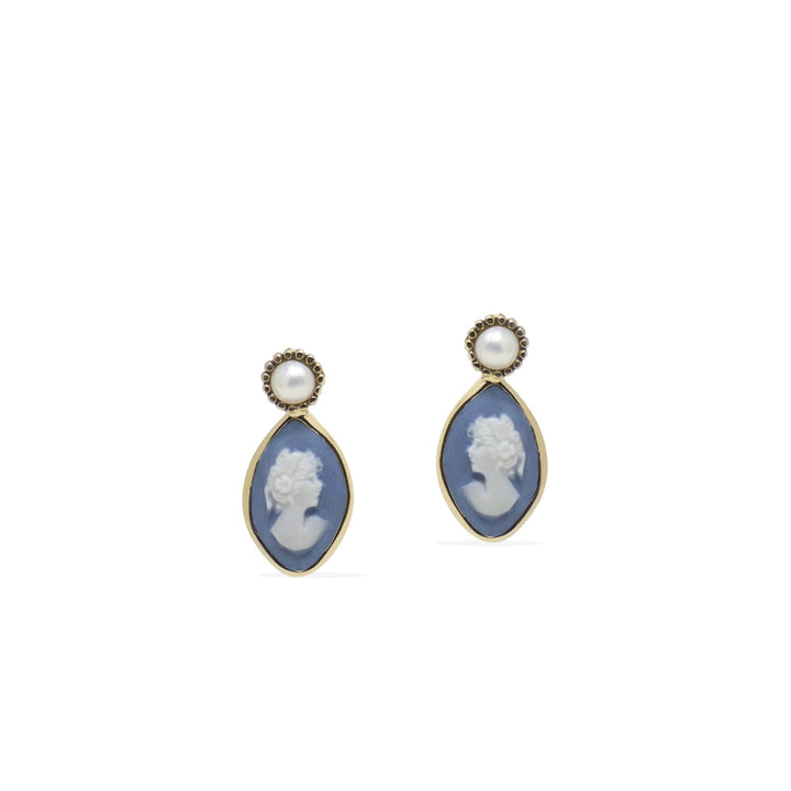 The Isabella Gold-Plated Sky Blue Cameo Stud Earrings by Vintouch are handmade from recycled gold-plated sterling silver. They feature hand-carved sky blue cameos made from porcelain and delicate freshwater pearls.