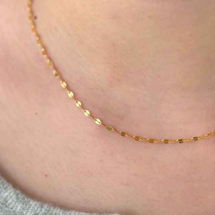 This Dainty Gold Sparkle Lip Chain Necklace by Nazzar fuses subtle shimmer with modern refinement. The delicate chain glimmers with sparkling details, creating a versatile piece that elevates both casual and formal outfits. Crafted with care and sustainability, it embodies Nazzar’s philosophy of enduring elegance and quality.