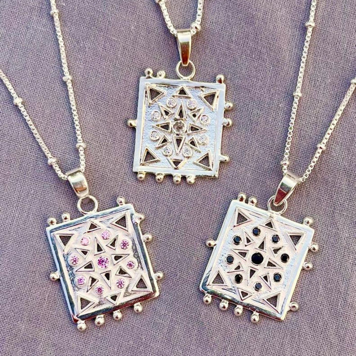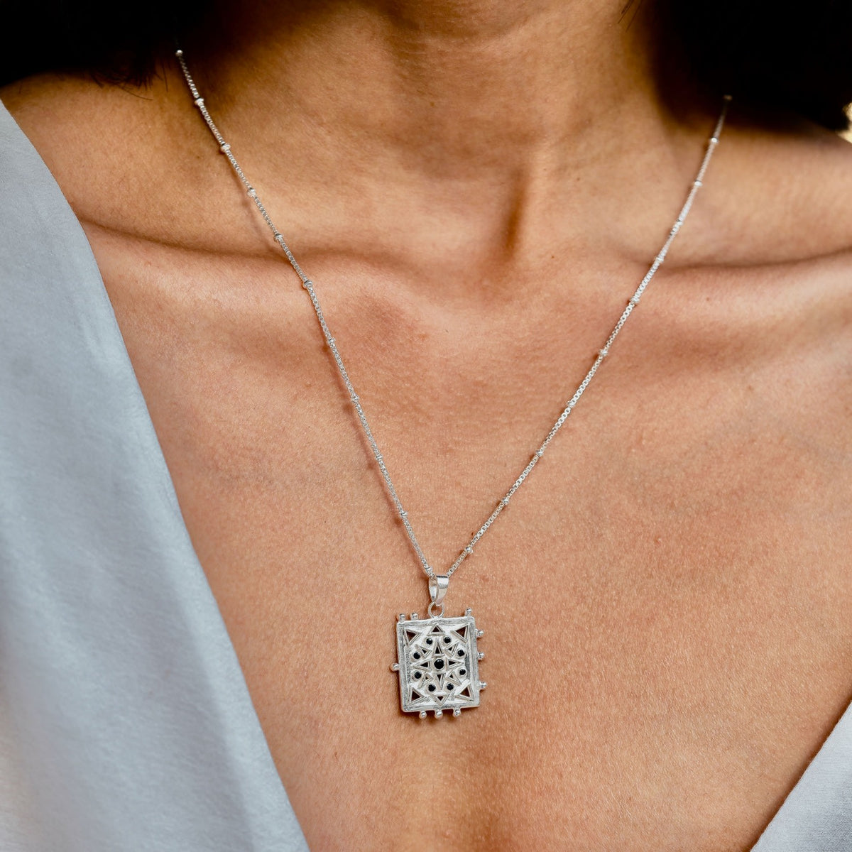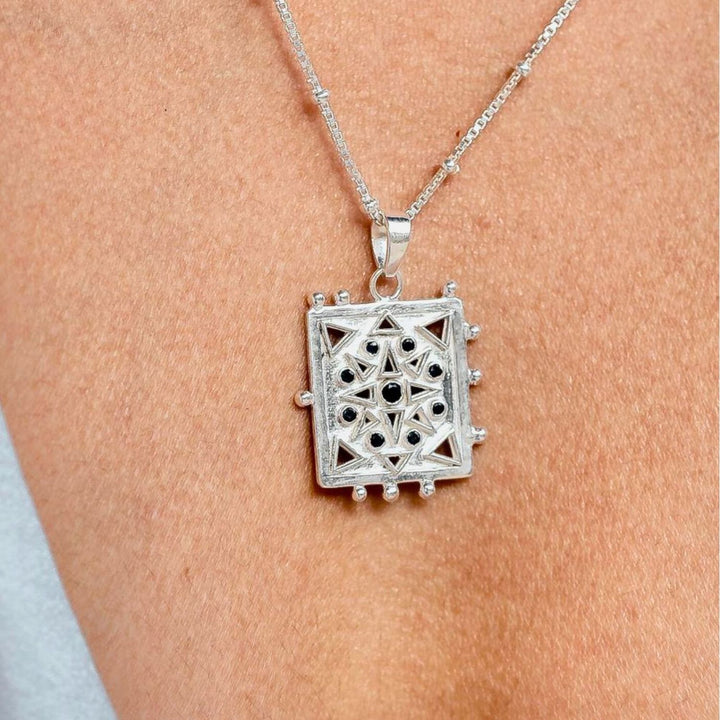This Udaipur Star Talisman Necklace - Smoky Black Quartz by Rize carries spiritual resonance and cultural beauty. Inspired by the stained-glass windows of Udaipur’s City Palace, its recycled sterling silver pendant is filled with nine smoky quartz stones—each symbolizing grounding, strength, and protection. A talisman of resilience, it’s also crafted with ethical values, supporting artisans and children’s charities.