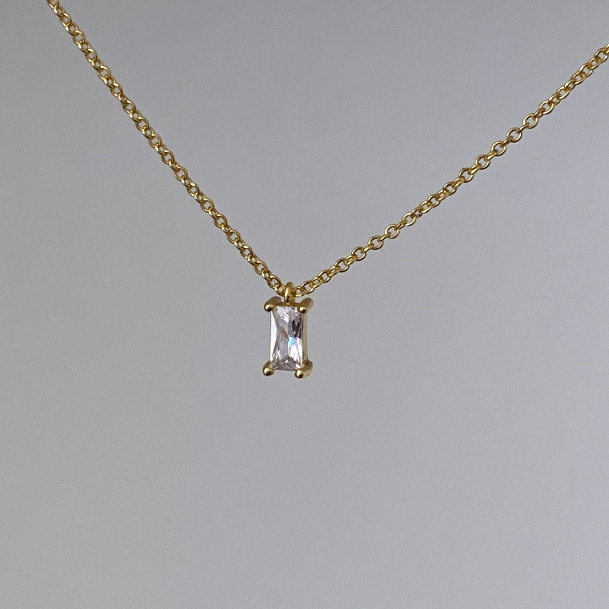 This Gold Solitaire Emerald Cut Pendant Necklace by Nazzar is a sleek symbol of modern elegance. A single baguette-cut stone shines at the centre of a fine gold chain, creating a minimalist piece with timeless sophistication. Subtle yet striking, it is ideal for layering or wearing solo.
