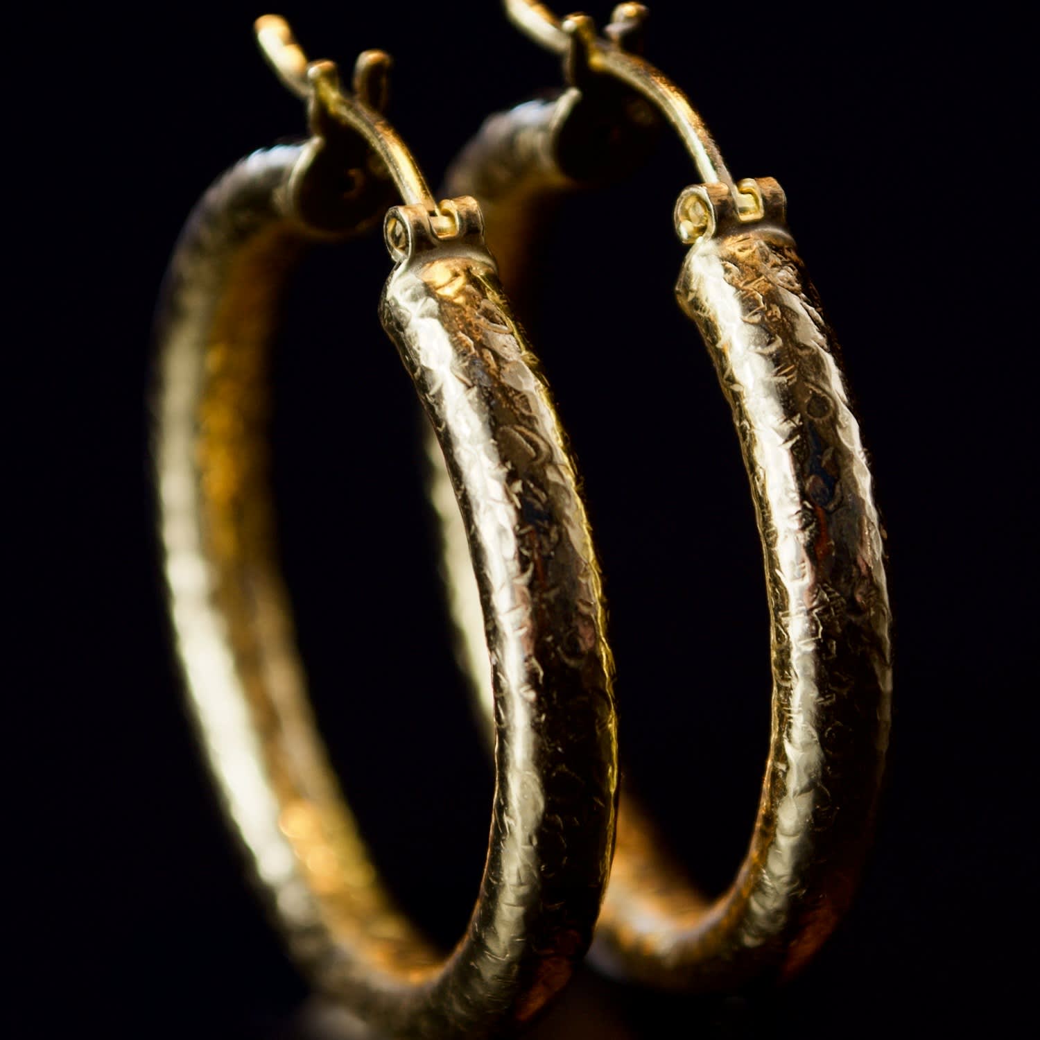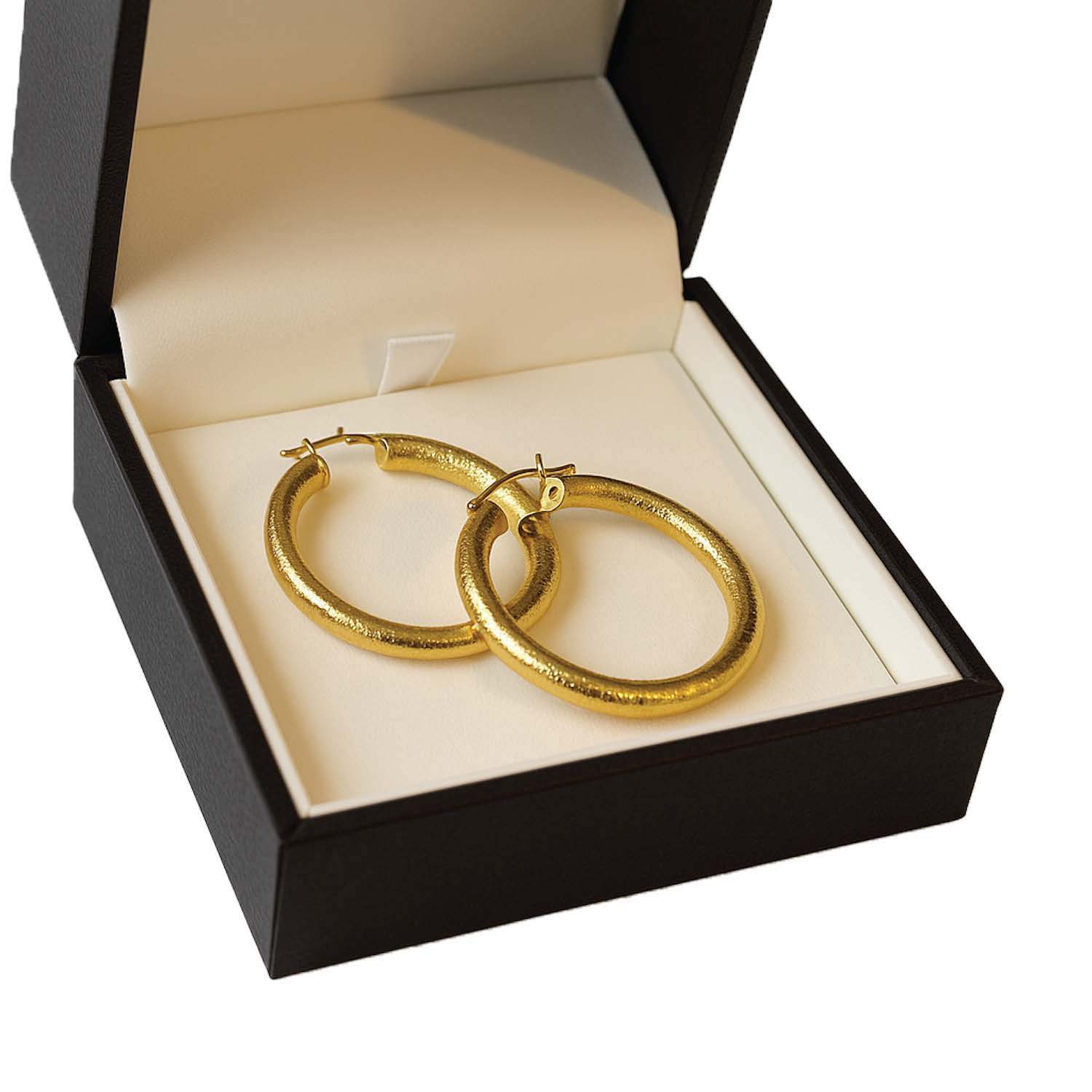 These large hoop earrings are made from sterling silver with 21-carat gold plating. They have a hammered snakeskin tube design and are 25mm in diameter.