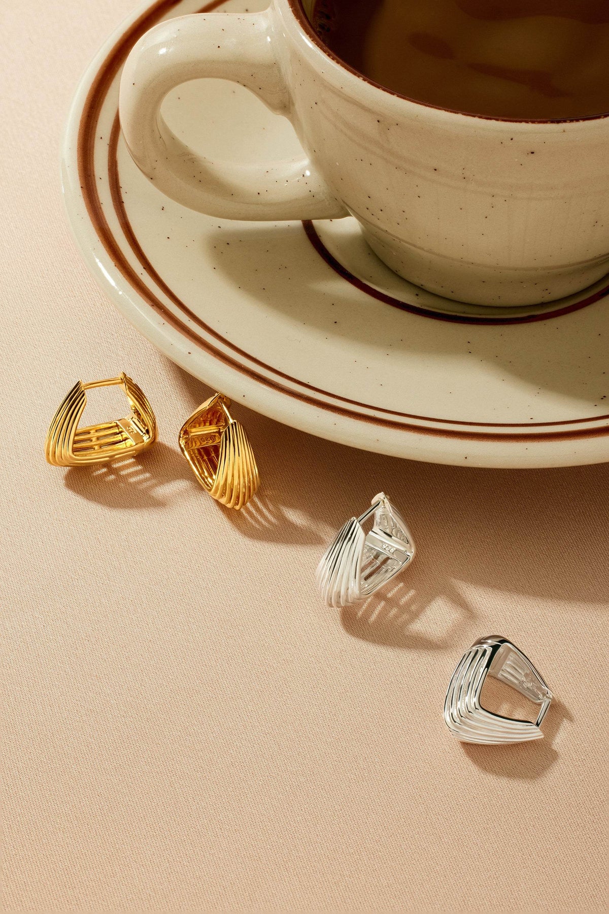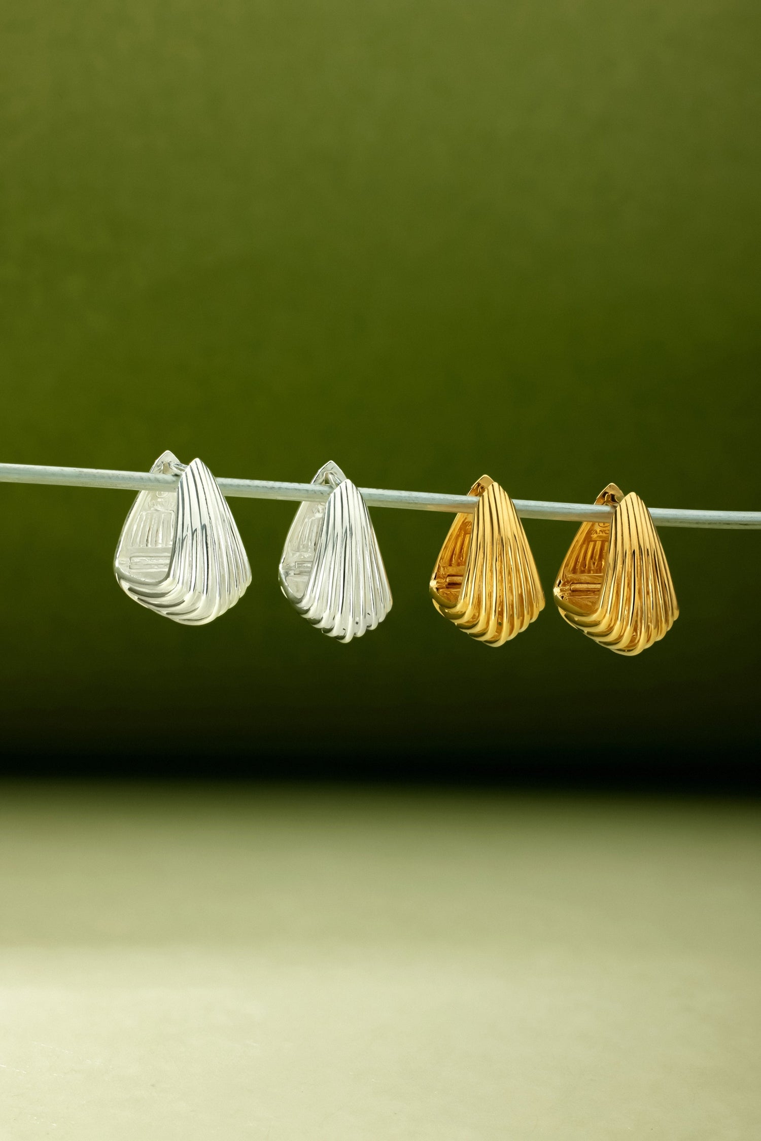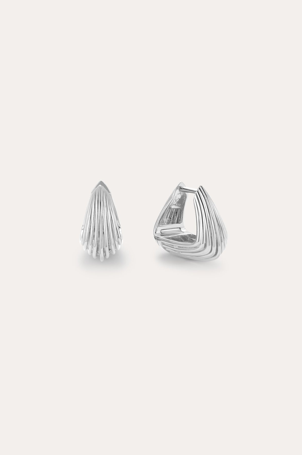 These chunky hoop earrings are made of 92.5% pure silver. They have a ridged design and a hinged clasp closure.