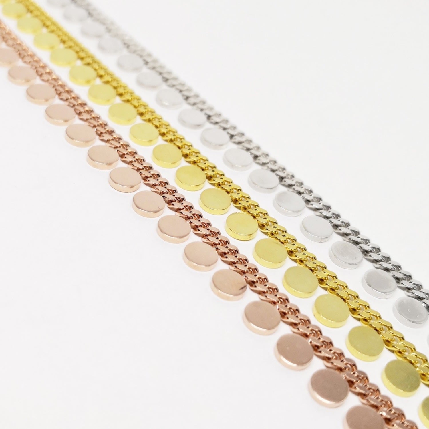 This necklace is made from 925 recycled sterling silver and features dangling disk coin charms throughout the chain. It is available in gold, silver, and rose-gold colors.