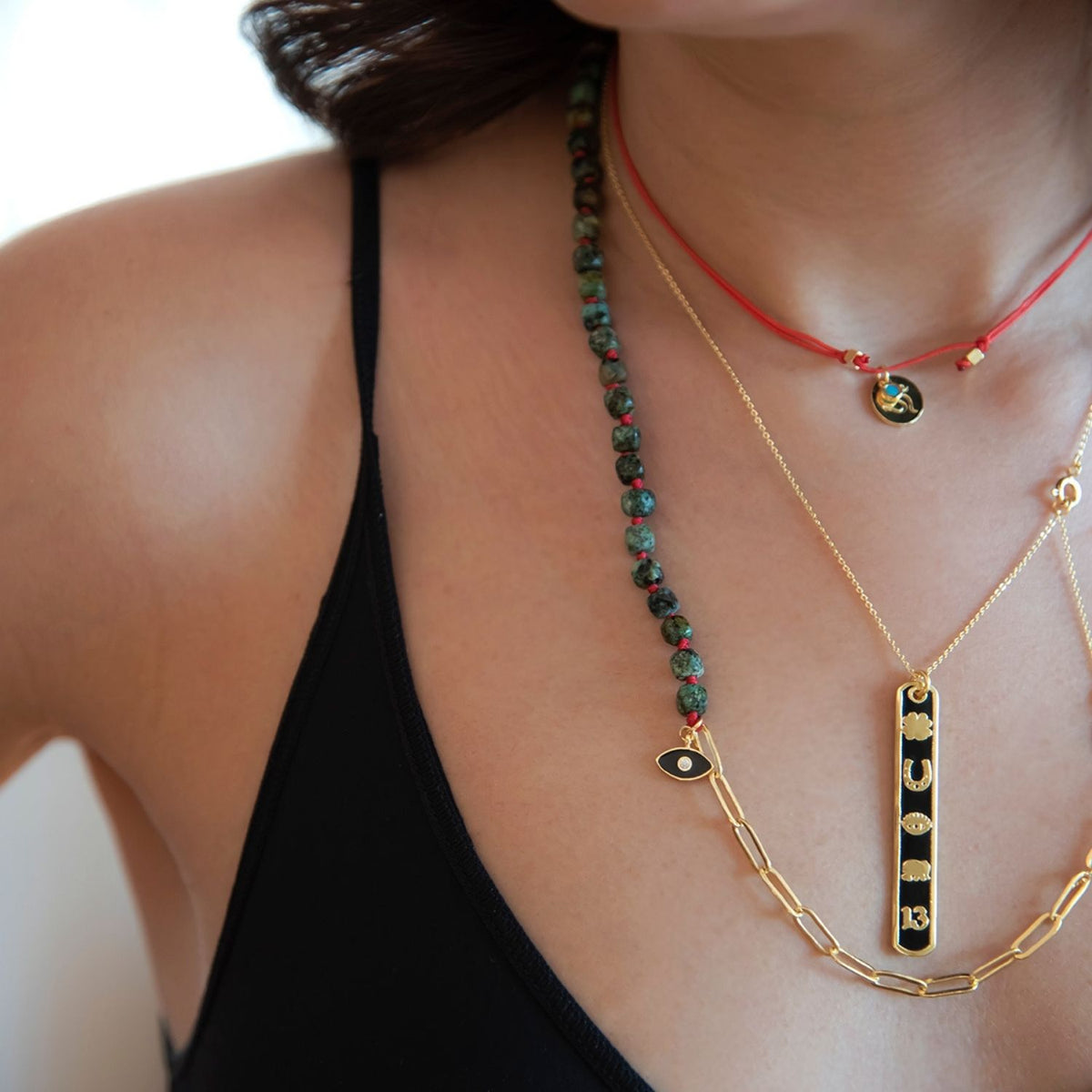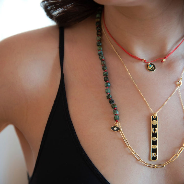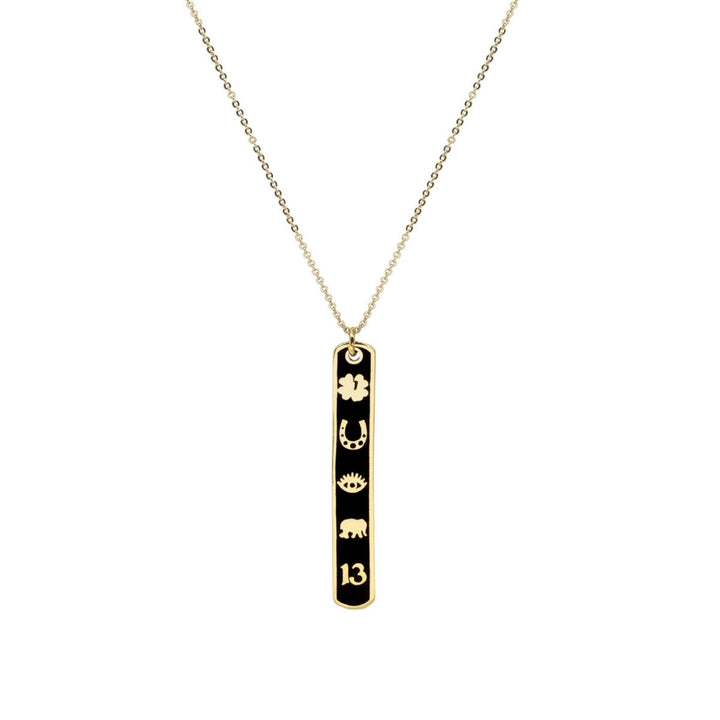 This Luckyou Black Pendant Necklace by Atelier Petites Pierres combines symbolic fortune with sleek design. A vertical bar coated in glossy black enamel is adorned with universal lucky motifs—an elephant, shamrock, horseshoe, eye, and number 13. Chic and meaningful, it’s a wearable charm for luck and style.