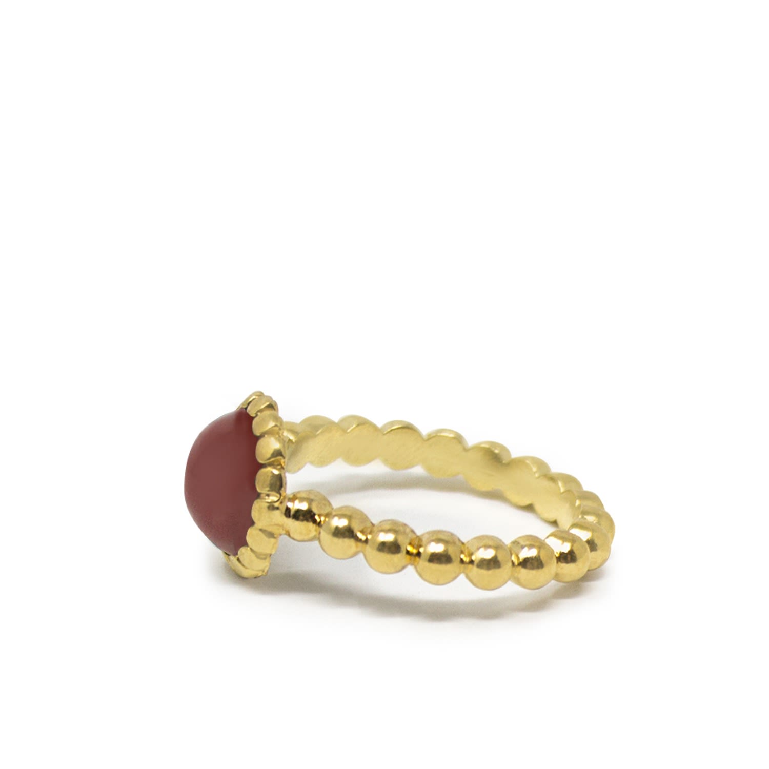 This ring is crafted from 18 karat gold over sterling silver with a 1-micron thickness. It features a natural carnelian stone set at the center.