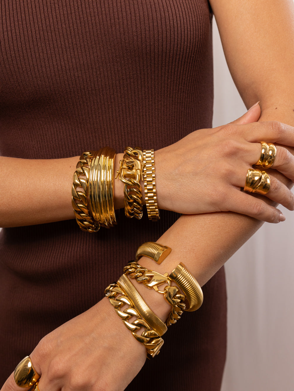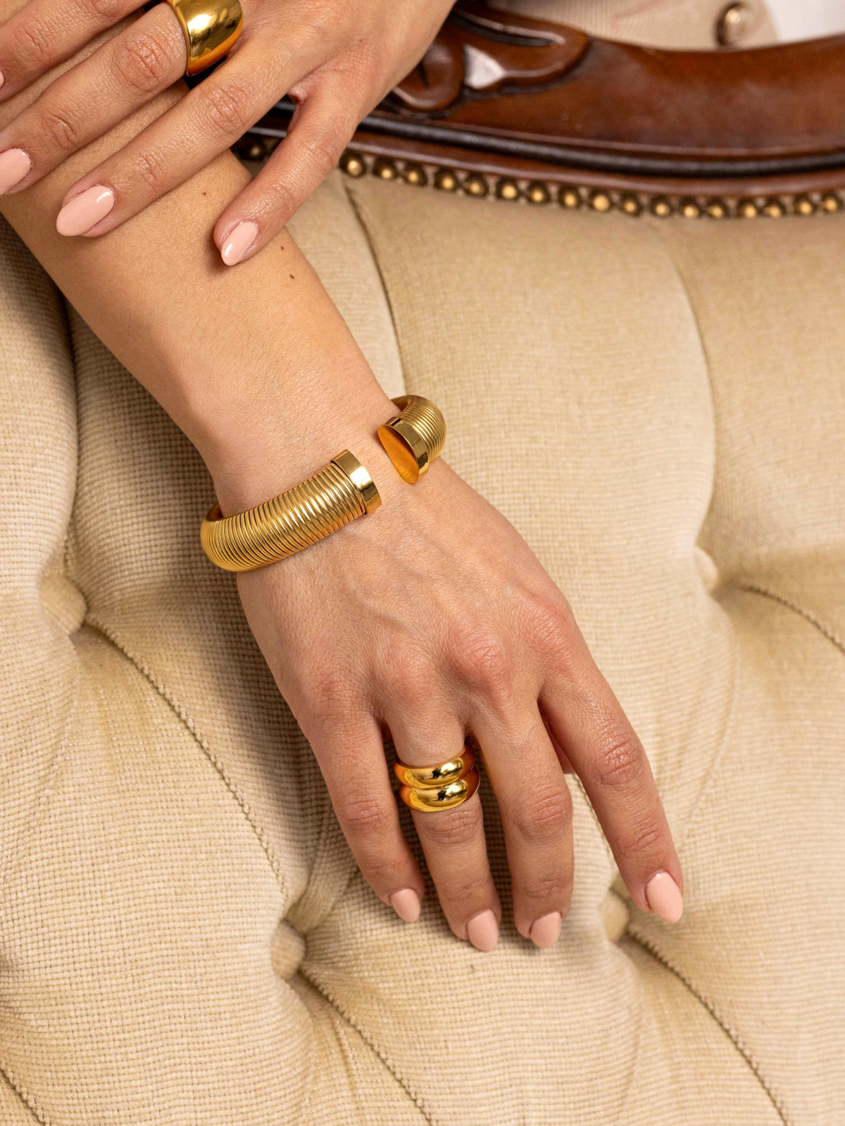 Introducing a vintage-inspired bangle that will quickly become the hero piece of your arm party. It is flexible making it easy to open and slide onto the wrist. It can be worn with the opening at either the front or back. Best styled with chunky rings.