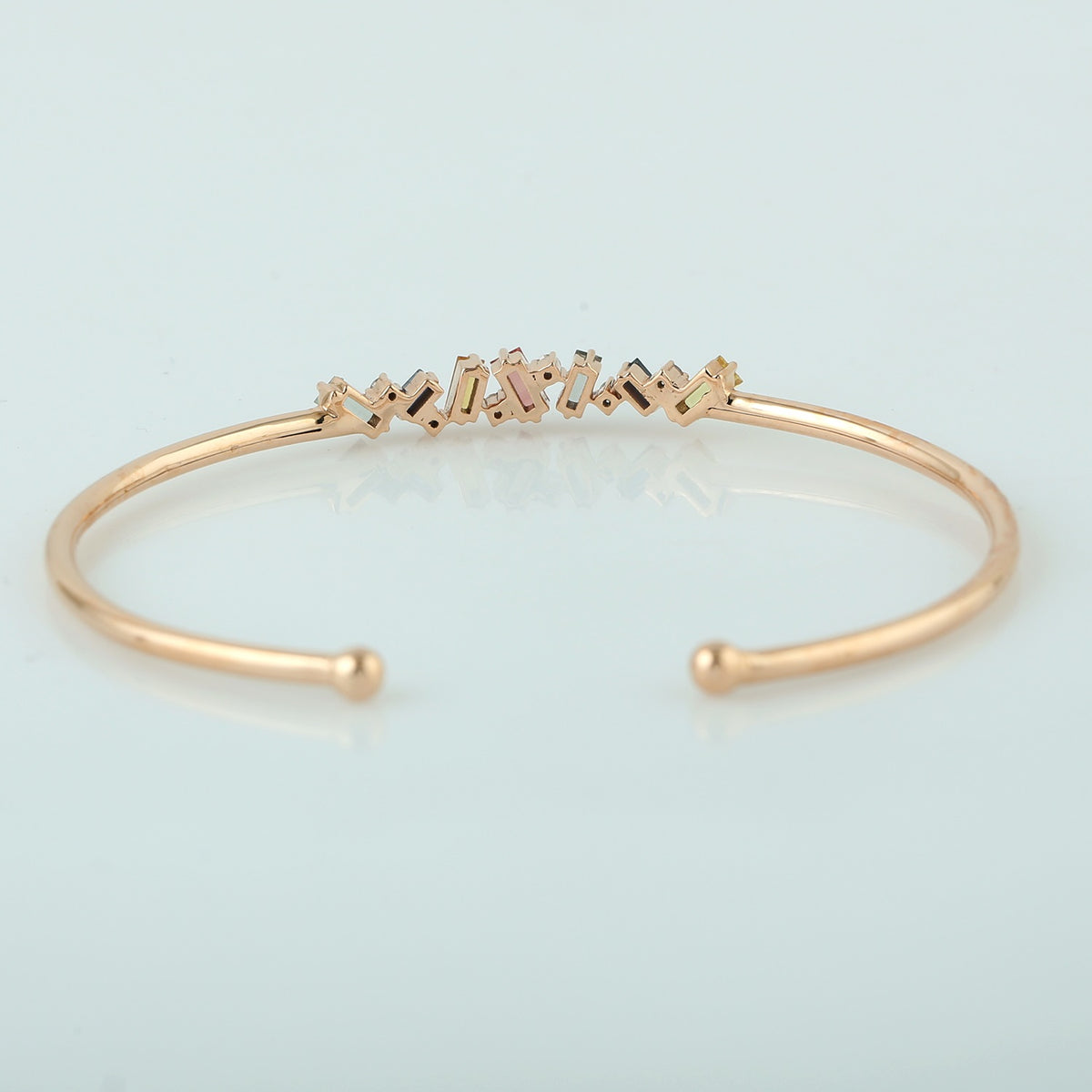 Elevate your wrist with the allure of the 18K Rose Gold Natural Diamond Prong & Rainbow Baguette Sapphire Cuff Bangle. This exquisite piece features a stunning array of rainbow baguette sapphires complemented by sparkling natural diamonds, all set in luxurious rose gold. Perfect for adding a vibrant touch of elegance to any ensemble.