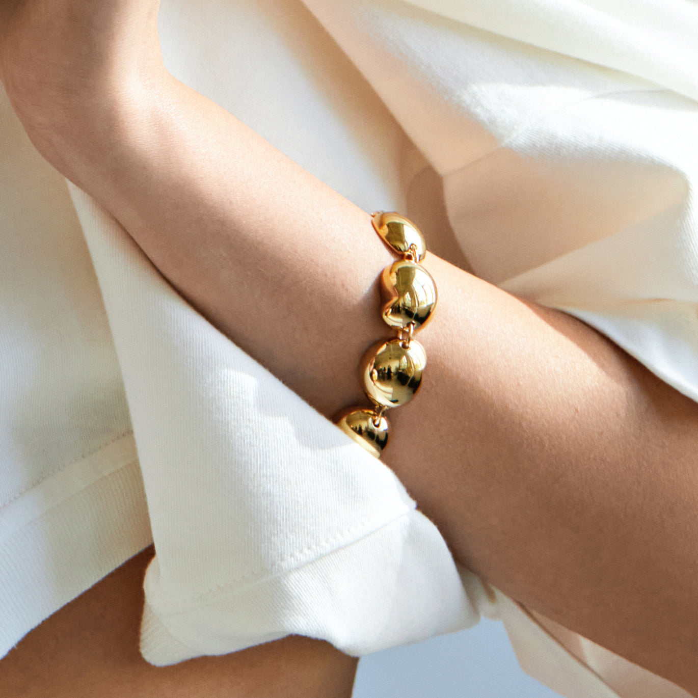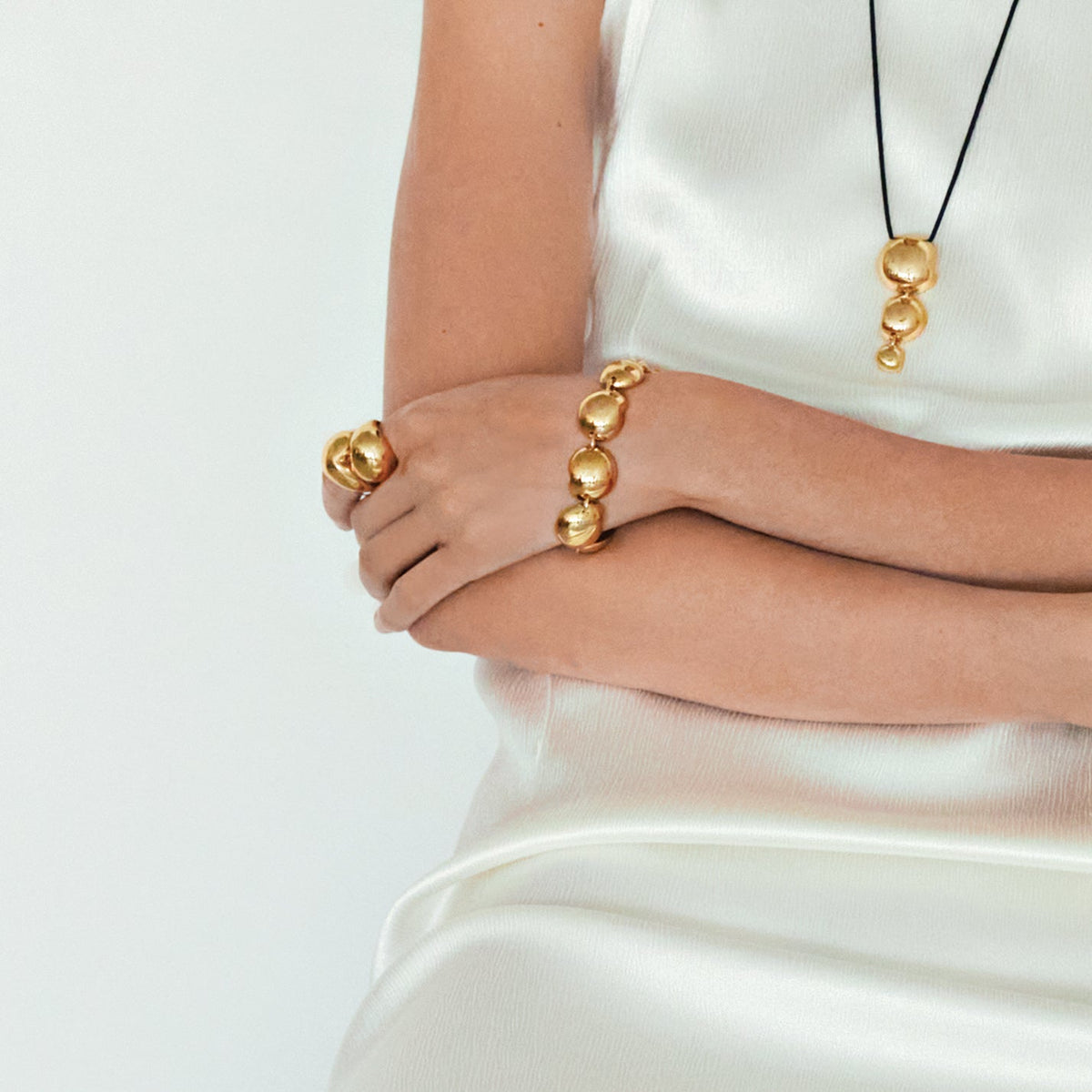 Molten liquid globs ooze into a high-shine bracelet packed with volume and lustre. With a nod to the sensual shape of a snail, the forms of the Nicola Bracelet are meticulously handcrafted to create movement and light-bending shine for maximum impact. It's that perfect day-to-night piece.