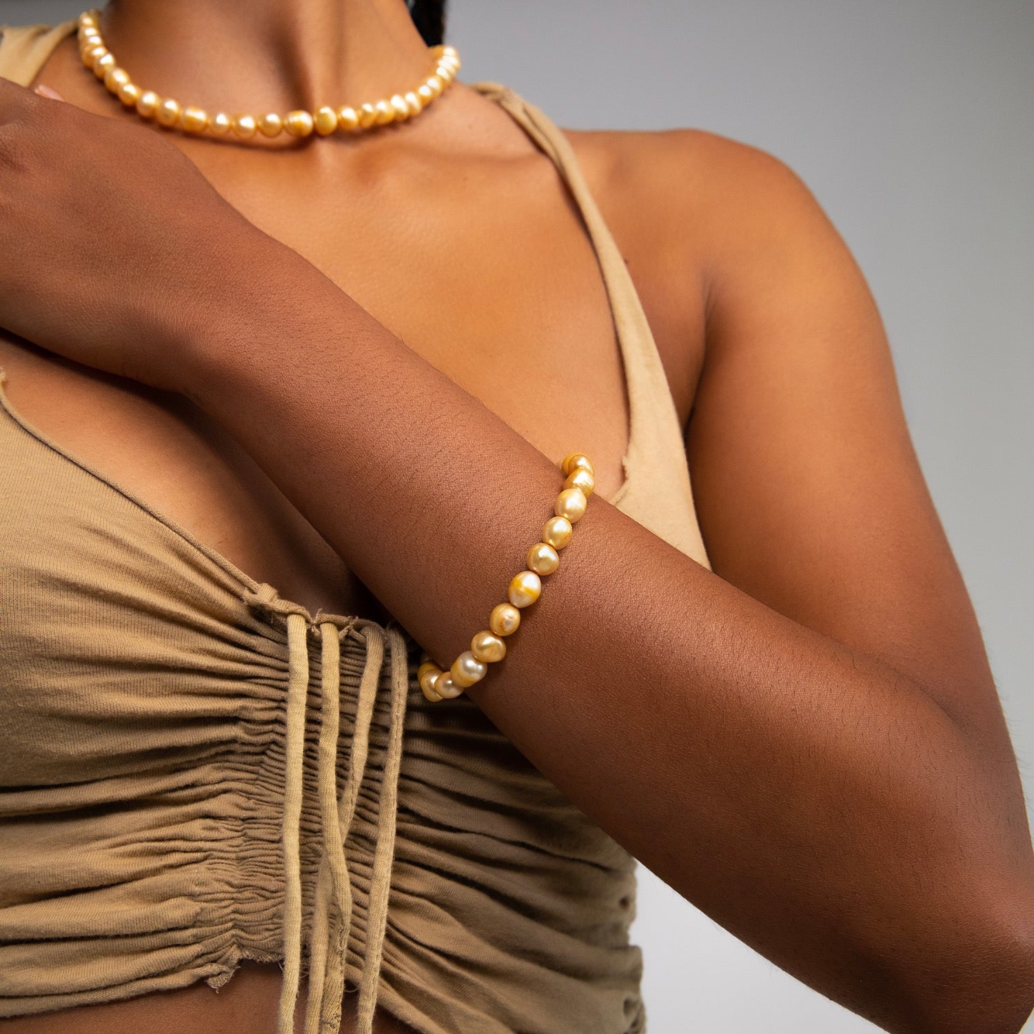 A butter-yellow bracelet featuring freshwater baroque pearls. Discover the natural beauty of our freshwater pearls, each one distinctly unique with slight variations in color and size. No two pieces are exactly alike, making yours truly one-of-a-kind.