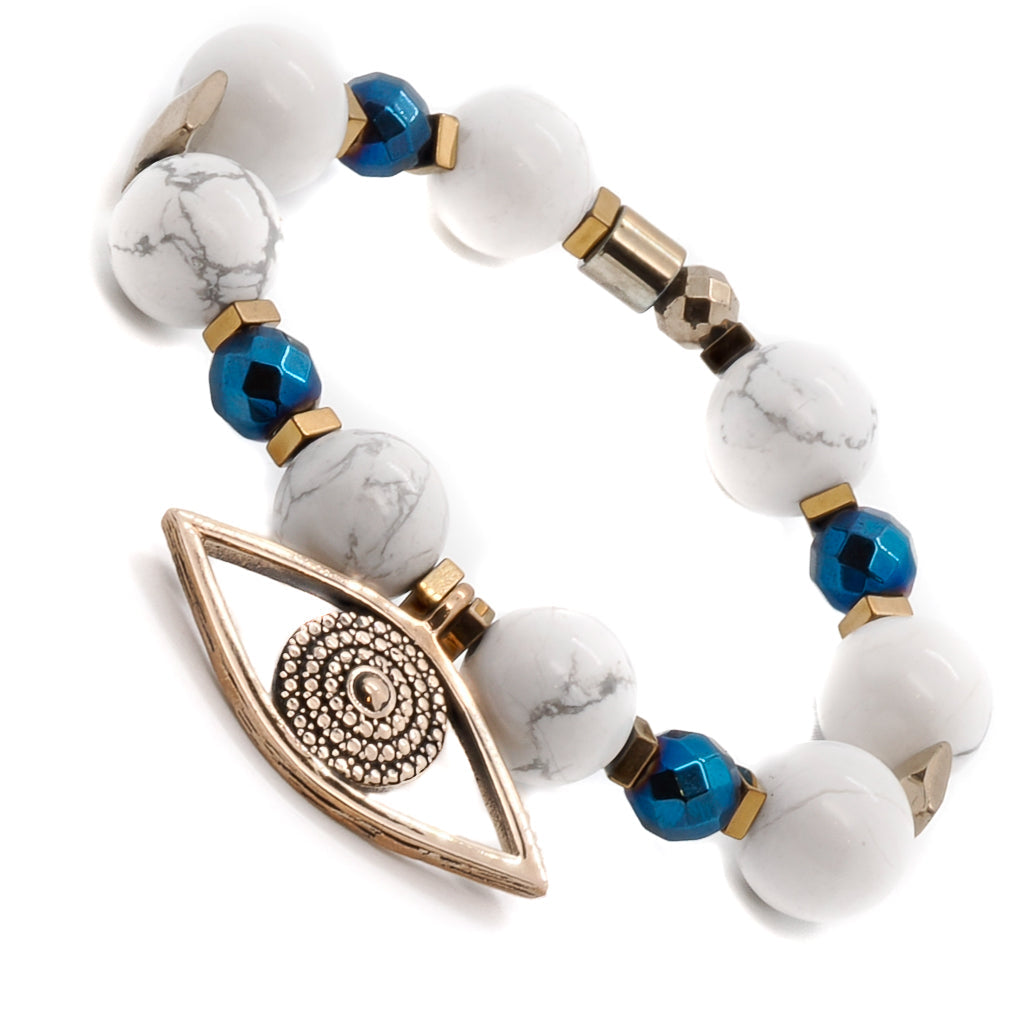 Gold plated bronze big size evil eye charm, Faceted 5mm gold hematite stones, 6mm Blue color hematite stone beads, 12mm White color Howlite stone beads