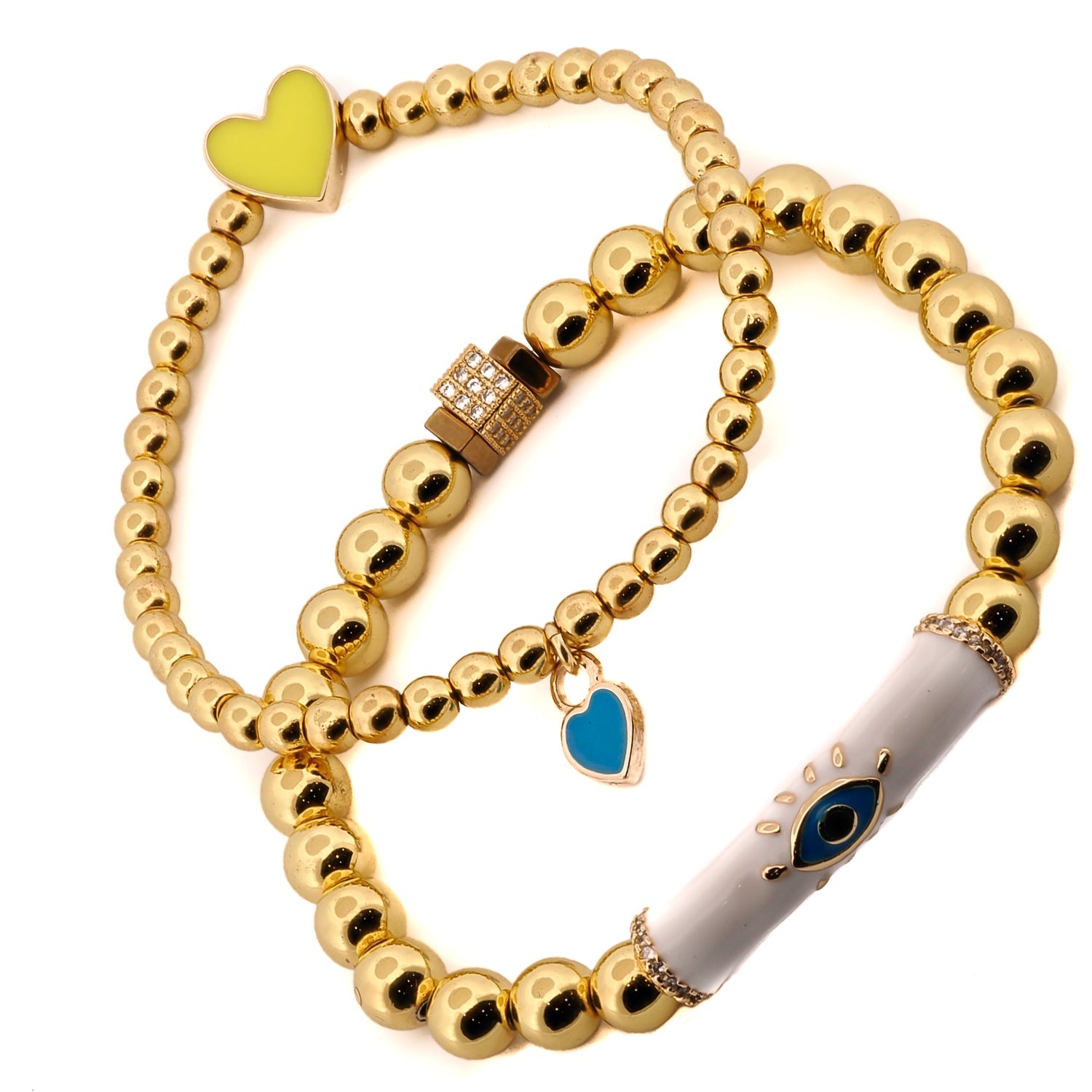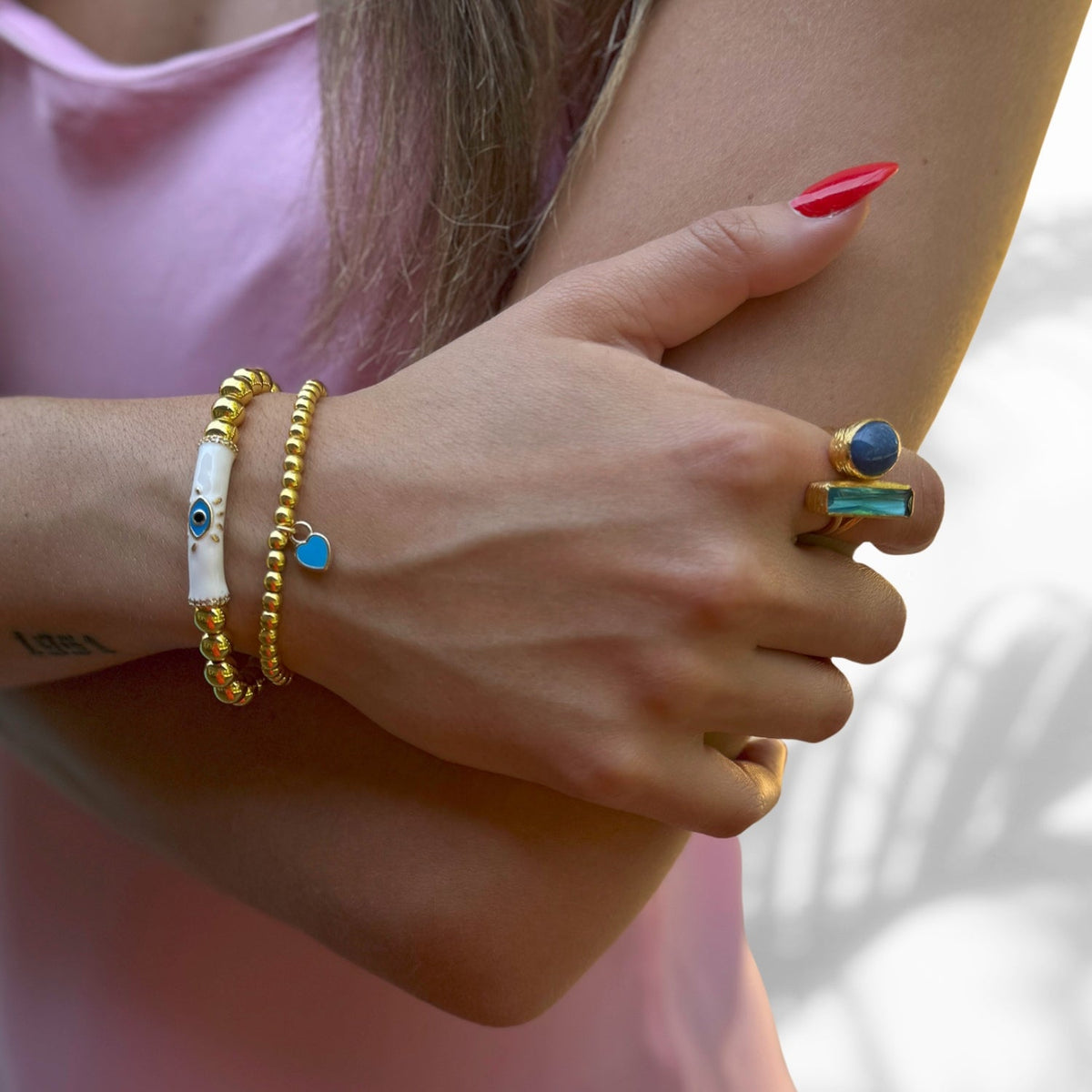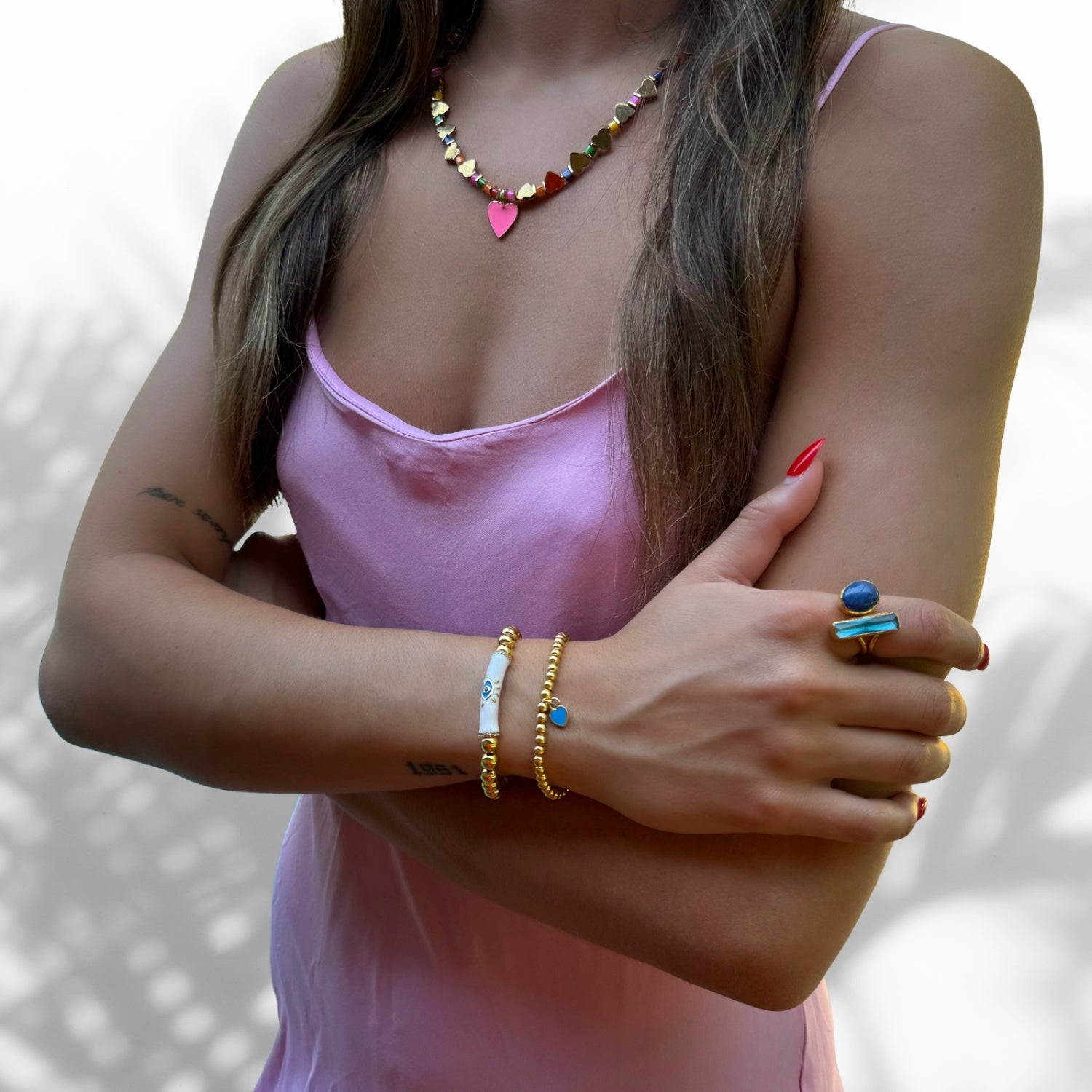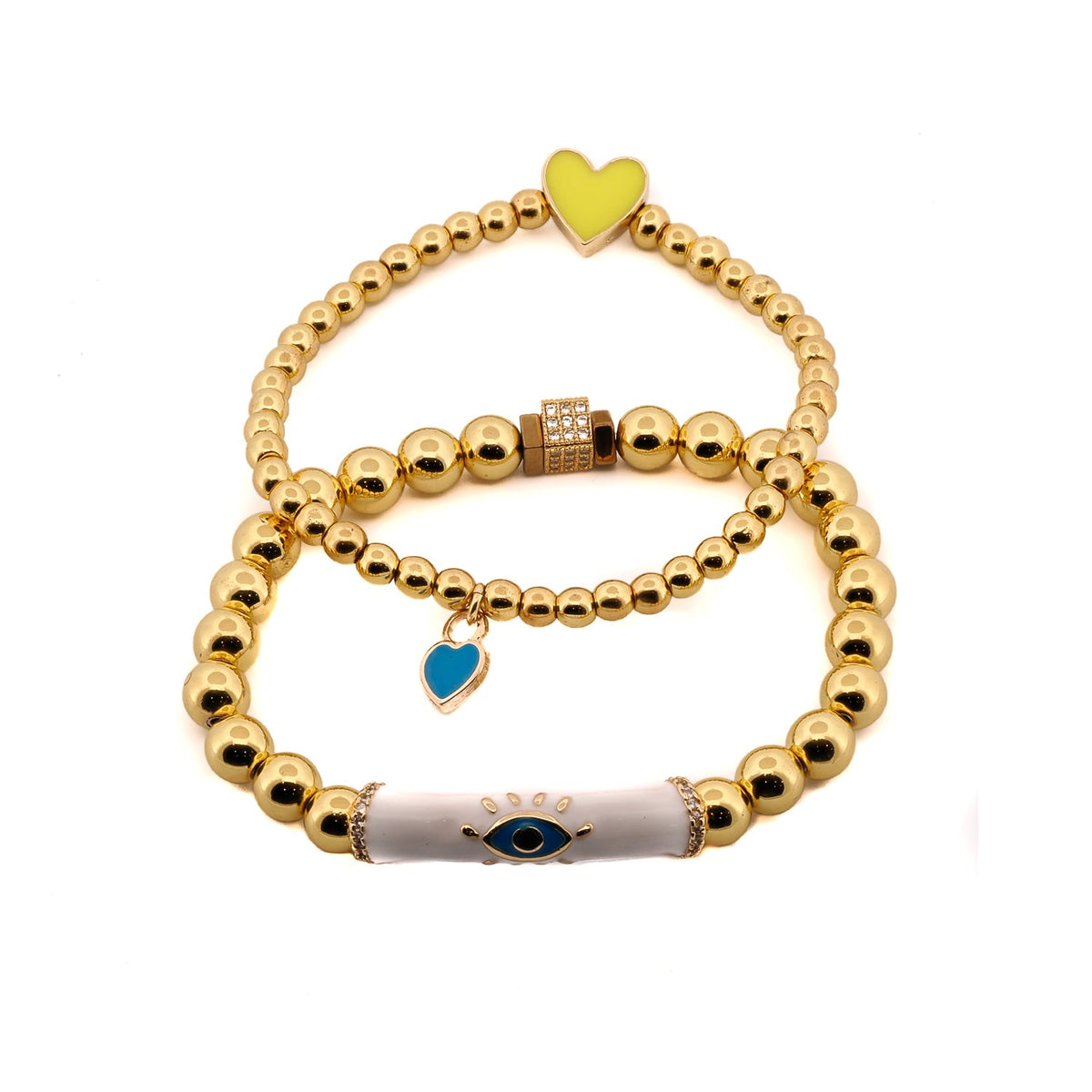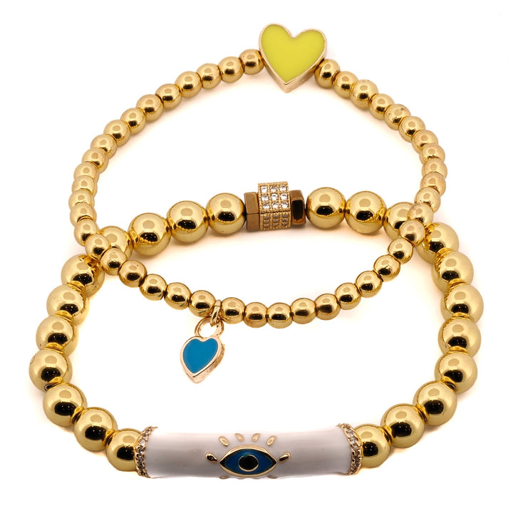 Embrace protection, luck, and love with our vibrant Evil Eye & Love Gold Beaded Bracelet Set. This colorful duo combines meaningful symbols with elegant design, making it a perfect accessory for adding positive energy and style to any outfit. Both bracelets in this set are crafted with gold plated hematite stone beads, known for their grounding and protective properties The first bracelet features a striking centerpiece an 18k gold plated white enamel evil eye tube bead. This bead symbolizes protection and wards off negative energy, ensuring you stay safe and positive. The second bracelet features a beautiful 18k gold plated blue charm and a neon yellow accent bead