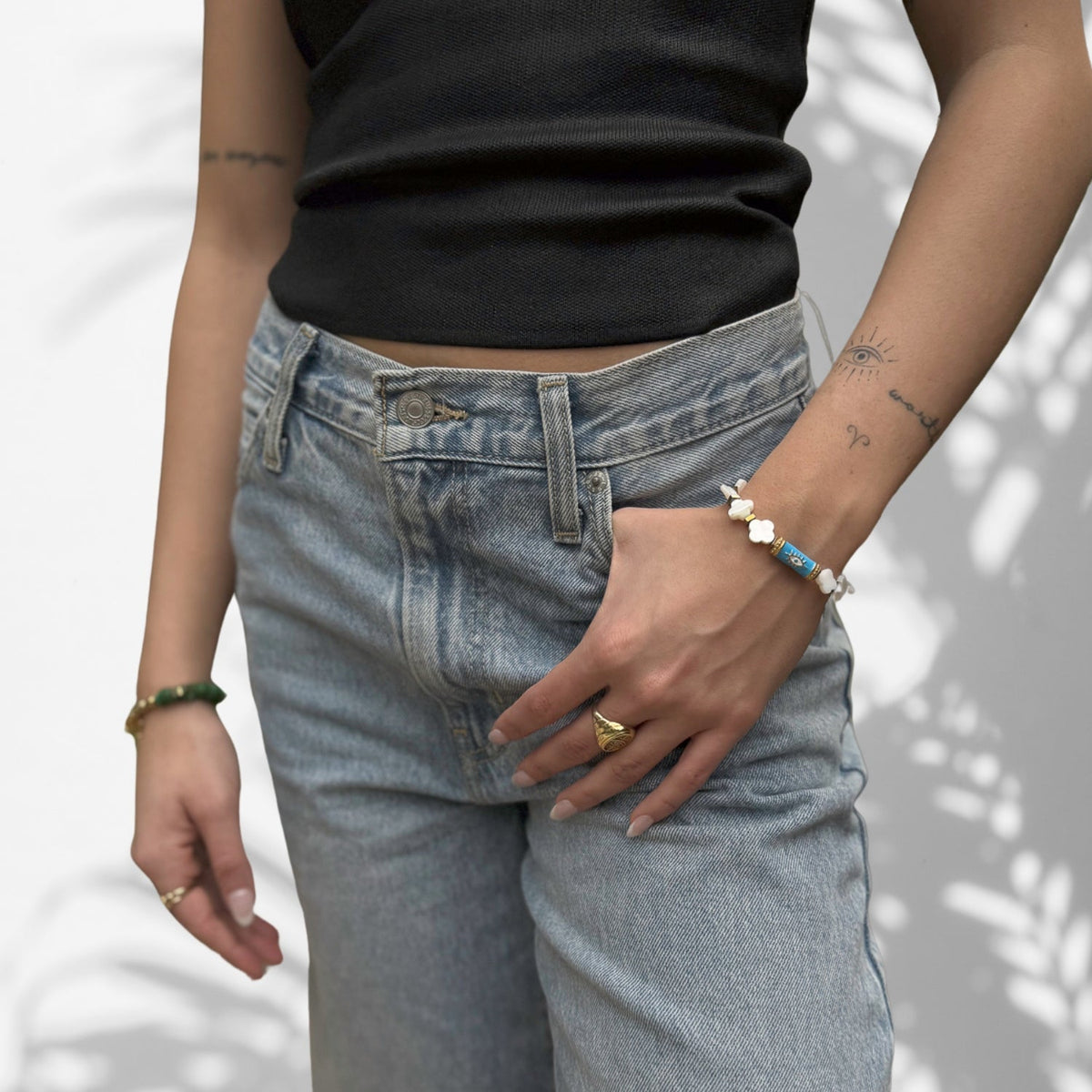 The Turquoise Evil Eye White Clover Good Luck Beaded Bracelet features a striking 18k gold-plated evil eye charm, adorned with turquoise enamel on a sterling silver base. The evil eye, a symbol believed to ward off negative energies and bring protection to the wearer, is rendered in a vibrant turquoise hue, adding both a pop of color and a touch of mystique to the bracelet. Complementing the evil eye charm are delicate white pearl clover beads, each bead intricately shaped like a four-leaf clover. These clover beads are not just elegant in their appearance but are also symbols of good luck and fortune, making the bracelet a token of positivity and prosperity.