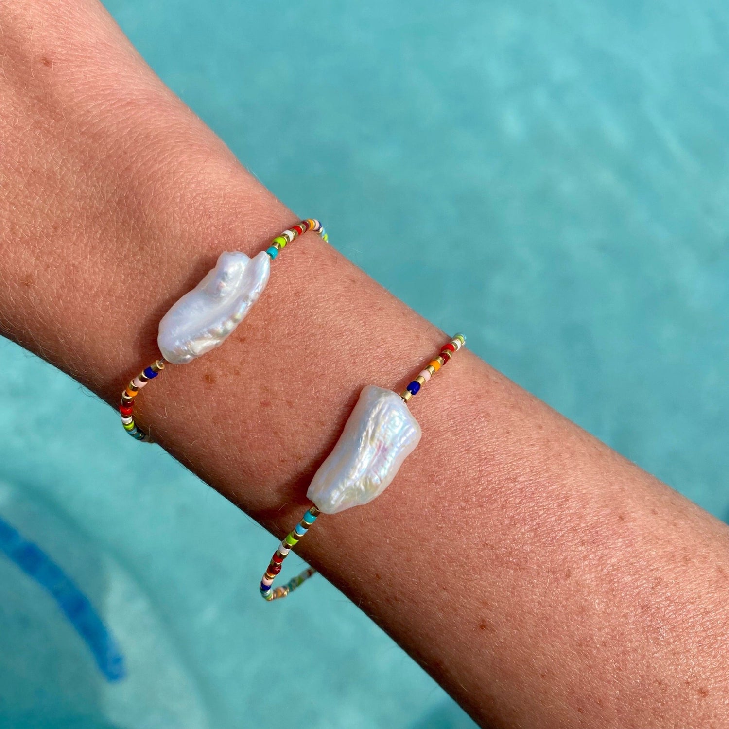Mix retro charm with contemporary colors for a lively piece of accessory you’ll enjoy wearing. The baroque pearl color beaded bracelet is a real eye-catcher, thanks to the beautiful baroque pearl ornament, strung with an assortment of gold and colored beads in an alternating sequence. The bracelet is adjustable and comes with a secure lobster clasp.