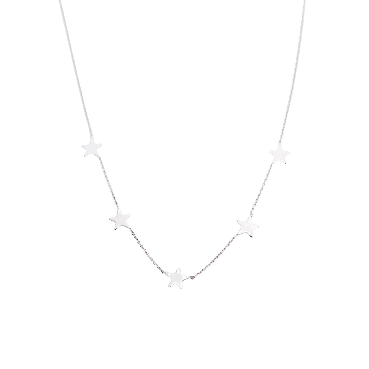This necklace is made from 925 recycled sterling silver. It features five stars on a delicate, adjustable chain.