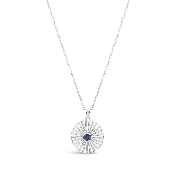 Crafted in 14k gold-plated 925 sterling silver with a synthetic sapphire centerpiece. Pendant design with anti-tarnish coating for durability.