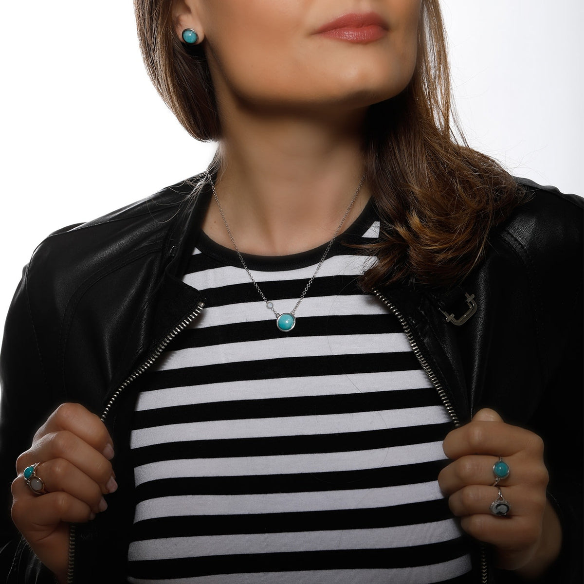 This Satellite Sterling Silver Amazonite & Opal Necklace by Vintouch Italy is an elegant piece from the space-inspired 'Satellite' collection. Cast from solid sterling silver, it features a beautiful turquoise amazonite stone and an iridescent opal cabochon. This piece is a perfect, elegant detail for both daytime and evening outfits. Its minimalist and artistic design makes it versatile for wearing solo or stacking with other necklaces.