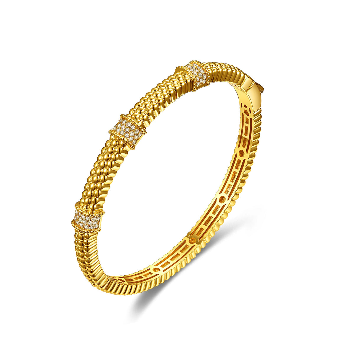 Celebrate your everyday style with this glam bangle bracelet featuring round brilliant cut -like cubic zirconias pave set in sparkling intervals. A highly textured design gives this statement bangle a dimensional appearance, all finely crafted in 14k gold plating. A hinged clasp keeps it secure.