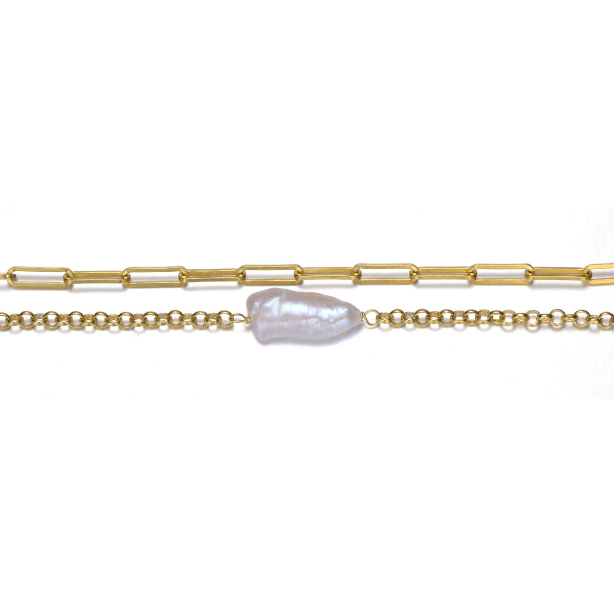 A chunky cultured free-form Freshwater pearl gives this double-layer bracelet an air of elegance. A rolo chain and cable chain give this trendy bracelet duo a hardware style, perfect for wearing to work, casual, or night. A lobster clasp and extension chain adjusts to your chosen wrist size.