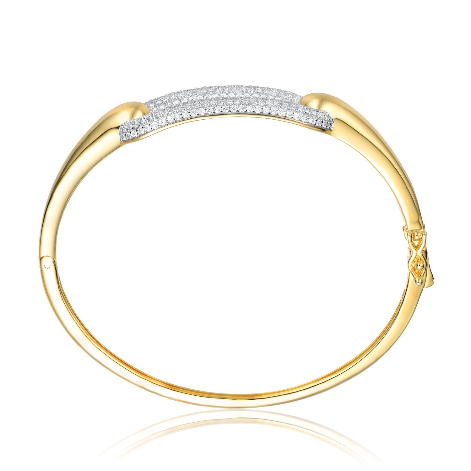 Sterling Silver 14k Yellow Gold Plated with Cubic Zirconia French Pave Geometric Link Bangle Bracelet. Add elegance to your day or night wardrobe with this stunning sterling silver 14k yellow gold plated bangle bracelet featuring round brilliant cut cubic zirconias French pave set on the top geometric open link. This ultra-shiny bracelet keeps secure with a box clasp on one side and a hinge on the other, creating effortless wearability for your convenience. The tapered, round shape silhouette from top to bottom allows this glam bracelet to sit gracefully on the wrist.