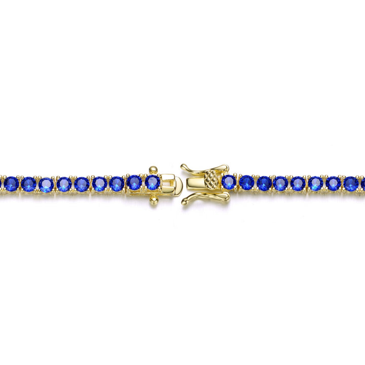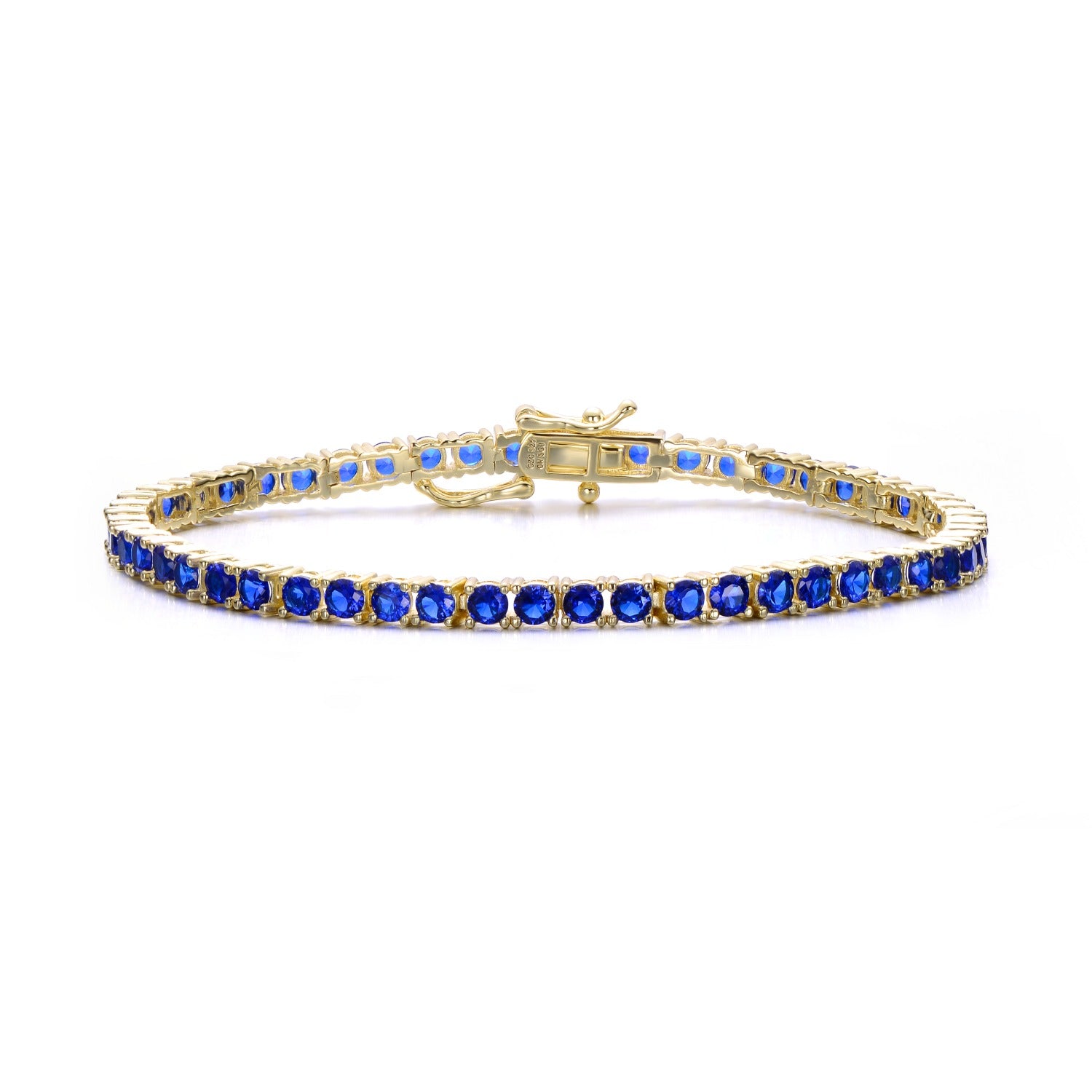 This fine and dainty tennis bracelet features round-cut Sapphire cubic zirconia stones in prong settings. Crafted of .925 sterling silver with your choice of yellow gold , this bracelet secures with a box clasp