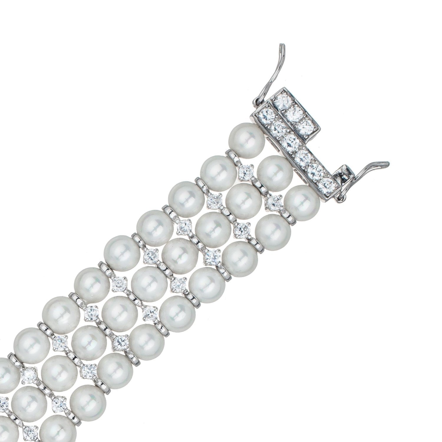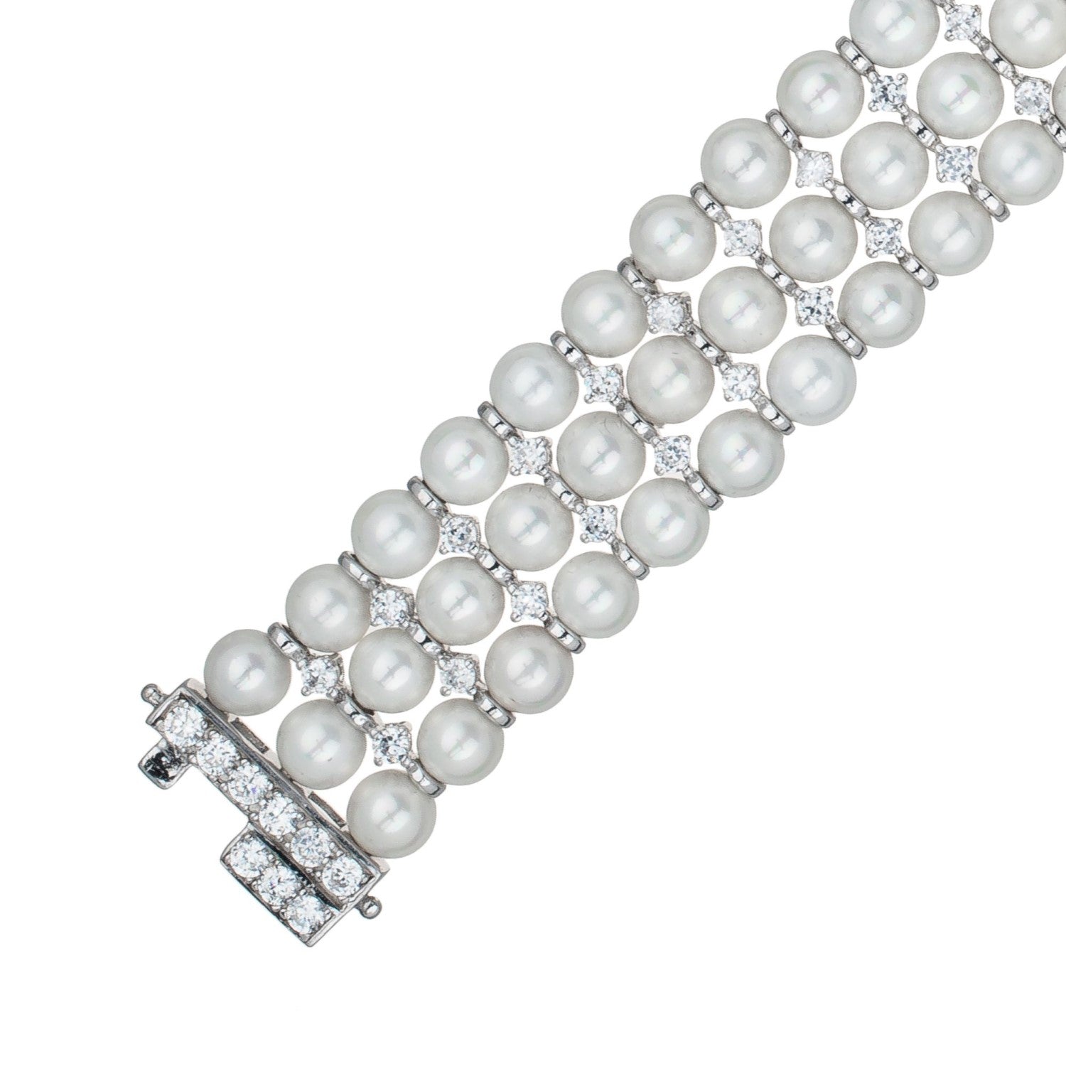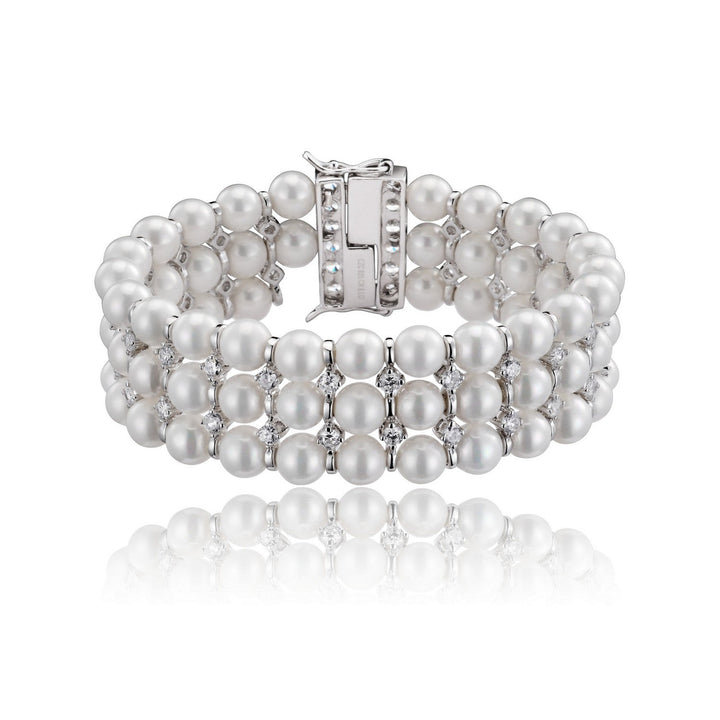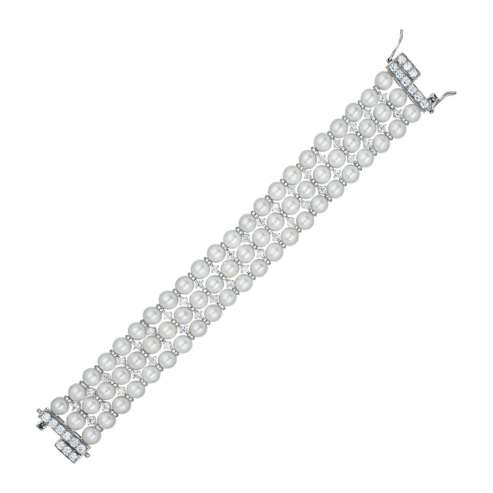Sterling Silver Cubic Zirconia Three Row Pearl Bracelet