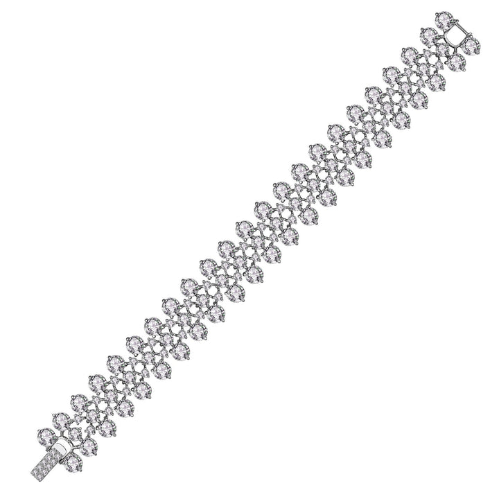 Stylish Sterling Silver Rhodium Plated Clear Cubic Zirconia Modern Tennis Bracelet. This beautiful bracelet features interesting design made out of large clear round cubic zirconia stones set in four prong setting in three rows. Crafted of Sterling Silver with Rhodium Plating, this is the perfect piece of jewelry for stylish combinations. This also makes a sensational gift for a special birthday or occasion.