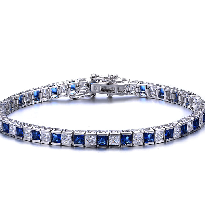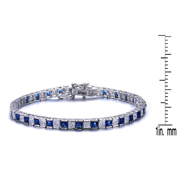 This classy .925 Sterling silver tennis bracelet is made out of clear and sapphire blue radiant cubic zirconia set in bar at skipped intervals. Crafted of .925 Sterling silver and secures with a box clasp. makes a great gift as well.