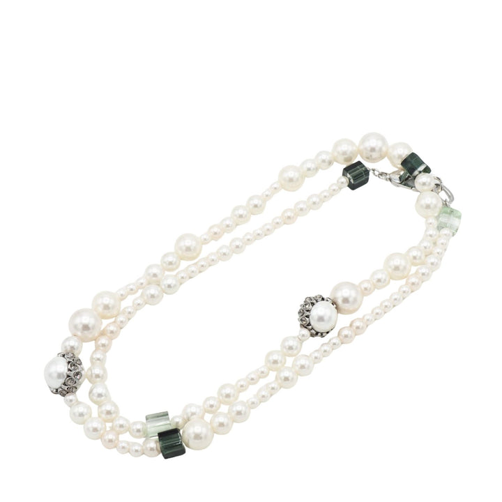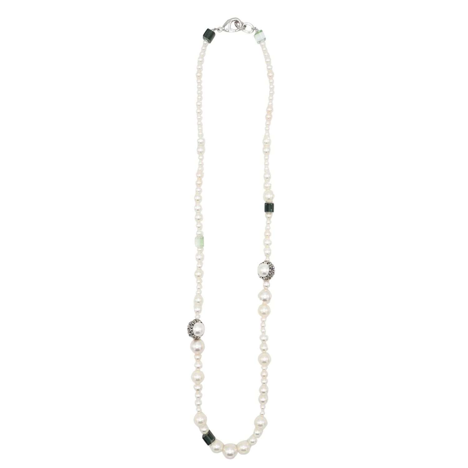 Handmade with pearl beads featuring crystal cores and green square crystals; total length 95cm; weight 135g.