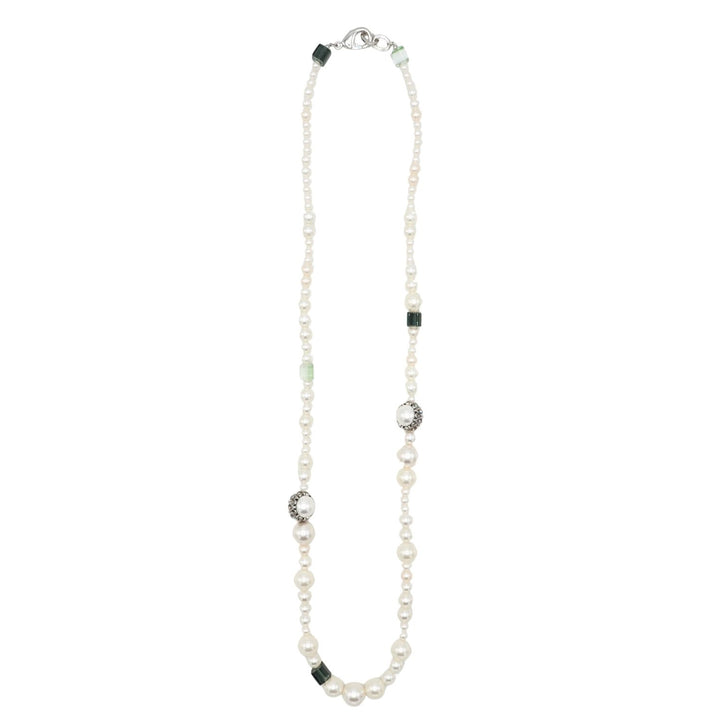This Long Valentina Necklace in Green by Sita Nevado is an expressive cascade of pearls and crystals. With luminous beads of varying sizes and green crystal accents, it layers beautifully for dramatic elegance. Its generous length allows versatile styling, from bold single drapes to chic double wraps.