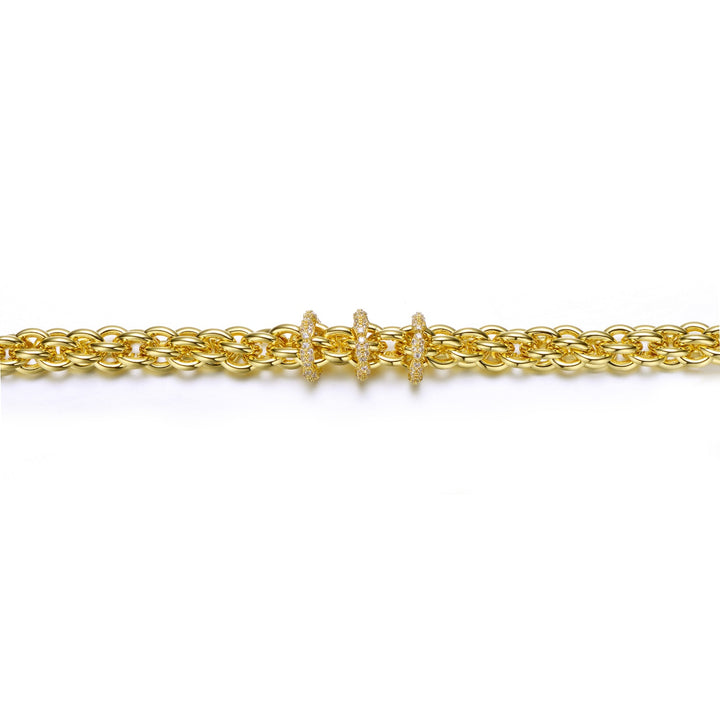14k Yellow Gold Plated with Cubic Zirconia Triple Circle Round Woven Braided Link Chain Bracelet. Nothing says modern luxury like a statement bracelet, perfect for pulling your look together at any time. This brightly polished 14k yellow gold plated bracelet sparkles with round brilliant cut -like cubic zirconias French pave set in three accent charm links. A woven braided oval chain gives it dimensional open spaces. A secure lobster clasp and capped ends add glamor to this elegant bracelet.