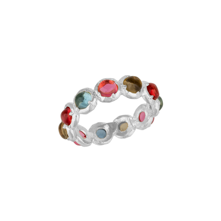 This ring is crafted from silver and is adorned with sparkling gemstones that are each 5mm in diameter.