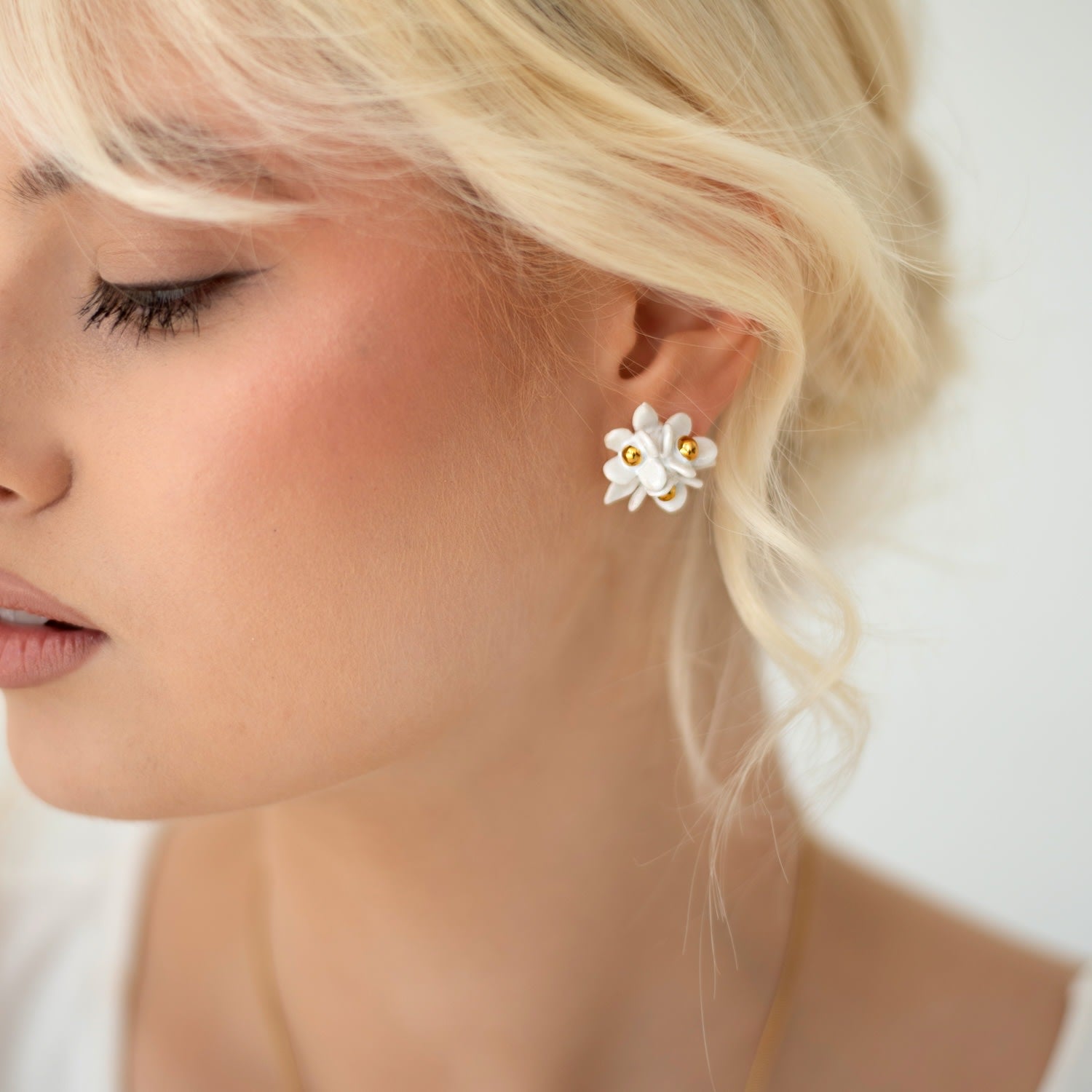 These stud earrings are hand-made from porcelain flowers with a 24k gold-over 925 sterling silver pin.