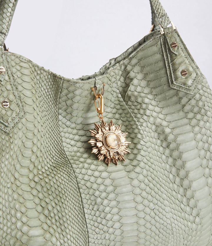 This Medallion Stone Charm by Lovard is a unique and eye-catching accessory designed to add a personal touch to your collection. The sun-burst motif and beautiful glass stone in the center create a striking visual that is both classic and modern. This versatile charm is perfect for adding a bit of personal style to any necklace or bracelet.