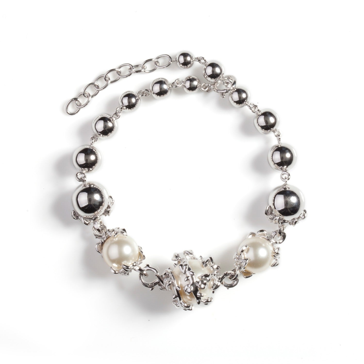 A stunning bracelet featuring 3 Swarovski Elements pearls linked with a series of metal orbs.