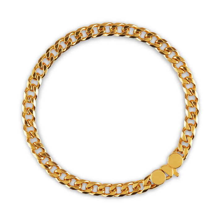 The Iron maiden Bracelet is a flat curb bracelet made in 925 sterling silver with 18ct Yellow gold plating on top. It has a unique innovative spring lobster clasp for extra safety.
